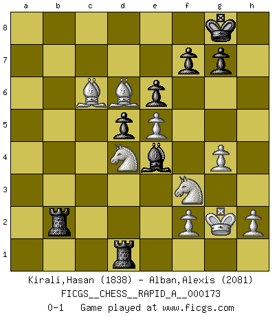 Last move : 0-1 2015 June 16 13:23:46 [Event "FICGS__CHESS__RAPID_A__000173"] [Site "FICGS"] [Date "2015.03.04"] [Round "1"] [White "Kirali,Hasan"] [Black "Alban,Alexis"] [Result "0-1"] [WhiteElo "1838"] [BlackElo "2081"] 1.d4 d6 2.Nf3 Nf6 3.Nc3 Bf5 4.g3 c6 5.Bg2 h6 6.O-O d5 7.Nd2 e6 8.e4 Bh7 9.Qe2 Be7 10.a3 O-O 11.Rd1 a5 12.b3 b5 13.e5 Nfd7 14.Nf3 Qb6 15.Be3 Qb7 16.Ne1 Na6 17.Bf1 Rfc8 18.Qg4 b4 19.Bxh6 Bf8 20.Ne2 bxa3 21.Bc1 Nb4 22.Rd2 c5 23.Qf4 a4 24.Rxa3 Nb6 25.dxc5 Bxc5 26.bxa4 Nc4 27.Rb3 Qa7 28.Nd4 Na2 29.Bb2 Nxd2 30.Qxd2 Qxa4 31.Bb5 Qa5 32.Qxa5 Rxa5 33.Bd7 Rca8 34.Bc6 Rd8 35.Nef3 Nb4 36.Bc3 Rb8 37.Bd7 Ra7 38.Bb5 Bxc2 39.Rxb4 Bxb4 40.Bxb4 Be4 41.Bd6 Ra1+ 42.Kg2 Rb7 43.Bc6 Rb2 44.g4 Rd1 0-1 This chess game has been lost on time (started : 2015.03.04 10:33:7) Queen's Pawn Kingside Castling by player White (move 6) Kingside Castling by player Black (move 10) Player Black won this chess game. Follow this game move after move (download)In Chess, as it is played by masters, chance is practically eliminated. (Emanuel Lasker) Privat ist Kortschnoi kein schlechter Mensch, sehr sympathisch. Aber während des Spiels ist er grausam. Er will dich töten. (Miguel Najdorf) Las piezas de Ajedrez son los bloques del alfabeto que moldean los pensamientos; y esos pensamientos, aunque hagan un diseño visual en el tablero, expresan abstractamente su belleza como un poema. (Marcel Duchamp) Les échecs sont un jeu terrible. Si vous n'avez pas le centre, votre adversaire a une position plus libre. Par contre, si vous avez le centre, alors vous avez vraiment quelque chose pour laquelle vous inquiéter ! (Siegbert Tarrasch) Without enthusiasm, virtue functions not at all, and vice only poorly. (Mignon McLaughlin, The Neurotic's Notebook, 1960)