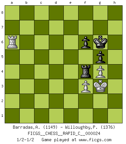 Last move : 1/2-1/2 2007 April 5 18:49:12 [Event "FICGS__CHESS__RAPID_C__000024"] [Site "FICGS"] [Date "2007.03.03"] [Round "1"] [White "Barradas,Anderson"] [Black "Willoughby,Peter"] [Result "1/2-1/2"] [WhiteElo "1149"] [BlackElo "1376"] 1.e4 e6 2.d4 d5 3.Nc3 Nf6 4.Bg5 Be7 5.Bxf6 Bxf6 6.e5 Bg5 7.Nf3 O-O 8.Be2 Nd7 9.Nb5 a6 10.Nxg5 Qxg5 11.Nxc7 Rb8 12.O-O Nxe5 13.dxe5 Qxe5 14.Nxd5 exd5 15.Re1 Qxb2 16.a4 Be6 17.Bf3 Qf6 18.Bxd5 Rbd8 19.c4 Bxd5 20.cxd5 Qd6 21.Qd2 Qxd5 22.Qxd5 Rxd5 23.Re7 b5 24.axb5 Rxb5 25.h3 Ra8 26.Rxa6 R5b8 27.Rea7 Rxa7 28.Rxa7 h5 29.g4 hxg4 30.hxg4 f6 31.Ra6 Kh7 32.Ra7 Rb3 33.Kg2 Kh6 34.f3 g5 35.Kg3 Rb4 36.Ra6 Kg6 37.Kf2 Rf4 38.Kg3 1/2-1/2 French : Classical, Anderssen variation Kingside Castling by player Black (move 7) Kingside Castling by player White (move 12) 10 pieces endgame at move 28 : White KRPPP , Black KRPPP WHITE : King + 1 Rook 3 Pawns BLACK : King + 1 Rook 3 Pawns 9 pieces endgame at move 29 : White KRPP , Black KRPPP WHITE : King + 1 Rook 2 Pawns BLACK : King + 1 Rook 3 Pawns 8 pieces endgame at move 30 : White KRPP , Black KRPP WHITE : King + 1 Rook 2 Pawns BLACK : King + 1 Rook 2 Pawns This chess game ended in a draw. Follow this game move after move (download)All I want to do, ever, is just play Chess. (Bobby Fischer) Ich habe die Schachforschung dermaßen betrieben, dass sie auf eine wissenschaftliche Basis gestellt wurde. (Mikhail Moiseyevich Botvinik) Me siento como si fuera una pieza en una partida de Ajedrez, cuando mi oponente me indica: esa pieza no puede ser movida. (Soren Kierkegaard) La menace est plus forte que l'exécution. (Aaron Nimzovitch) The real danger is not that computers will begin to think like men, but that men will begin to think like computers. (Sydney J. Harris)