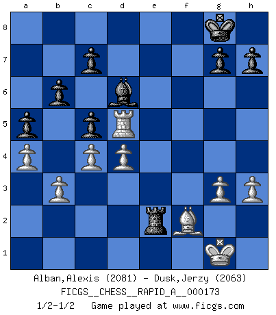 Last move : 1/2-1/2 2015 March 25 20:44:47 [Event "FICGS__CHESS__RAPID_A__000173"] [Site "FICGS"] [Date "2015.03.04"] [Round "1"] [White "Alban,Alexis"] [Black "Dusk,Jerzy"] [Result "1/2-1/2"] [WhiteElo "2081"] [BlackElo "2063"] 1.e4 e5 2.Nf3 Nc6 3.Bb5 a6 4.Ba4 Nf6 5.O-O Be7 6.Bxc6 dxc6 7.d3 Nd7 8.Be3 O-O 9.Nbd2 Re8 10.h3 a5 11.Nc4 f6 12.a4 Nb6 13.Qe2 Nxc4 14.dxc4 Qd7 15.b3 b6 16.Rfd1 Qe6 17.Rd3 Bb7 18.Rad1 c5 19.Nd2 f5 20.exf5 Qxf5 21.f3 Rad8 22.Rxd8 Rxd8 23.Nb1 Bd6 24.Nc3 e4 25.Nxe4 Bxe4 26.fxe4 Qe5 27.Rd5 Qxe4 28.Qd3 Qe6 29.Qc3 Re8 30.Bf2 Qh6 31.Qd2 Qf6 32.g3 Qf3 33.Qd3 Qxd3 34.cxd3 Re2 35.d4 1/2-1/2 Ruy Lopez : Exchange variation doubly deferred (DERLD) Kingside Castling by player White (move 5) Kingside Castling by player Black (move 8) This chess game ended in a draw. Follow this game move after move (download)When asked, -How is that you pick better moves than your opponents?, I responded: I'm very glad you asked me that, because, as it happens, there is a very simple answer. I think up my own moves, and I make my opponent think up his. (Alexander Alekhine) Die Arbeit ist etwas Unnatürliches. Die Faulheit allein ist göttlich. (Anatole France) La esencia del Ajedrez es pensar acerca de lo que el Ajedrez es. (David Bronstein) Tout change constamment, y compris dans le monde des Echecs. (Botvinnik) Do you know these so called Volunteers don't even get paid! (Simpsons)