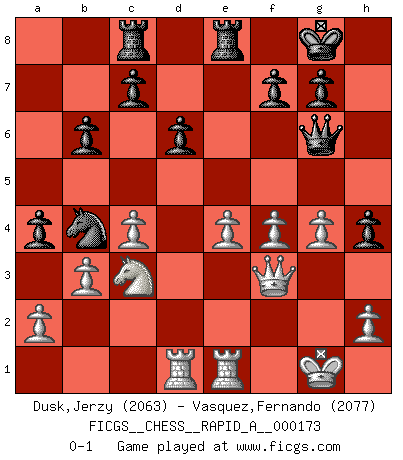 Last move : 0-1 2015 June 19 13:30:35 [Event "FICGS__CHESS__RAPID_A__000173"] [Site "FICGS"] [Date "2015.03.04"] [Round "1"] [White "Dusk,Jerzy"] [Black "Vasquez,Fernando"] [Result "0-1"] [WhiteElo "2063"] [BlackElo "2077"] 1.d4 Nf6 2.c4 e6 3.Nf3 b6 4.g3 Ba6 5.b3 Bb4+ 6.Bd2 Bxd2+ 7.Qxd2 O-O 8.Bg2 Bb7 9.O-O d6 10.Nc3 Ne4 11.Nxe4 Bxe4 12.Rad1 Nd7 13.Nh4 Bxg2 14.Nxg2 a5 15.e4 Qf6 16.f3 Rfd8 17.Ne3 Qg6 18.Qc2 h5 19.Ng2 Re8 20.Qe2 Rad8 21.Nh4 Qh7 22.Rfe1 e5 23.dxe5 Nxe5 24.Nf5 Nc6 25.Ne3 h4 26.Nd5 Rc8 27.g4 Qg6 28.Qf2 Qh6 29.f4 Qg6 30.Qf3 Nb4 31.Nc3 a4 0-1 This chess game has been lost on time (started : 2015.03.04 10:33:7) Queen's Indian : Nimzovich variation (exaggerated Fianchetto) Kingside Castling by player Black (move 7) Kingside Castling by player White (move 9) Player Black won this chess game. Follow this game move after move (download)Chess problems demand from the composer the same virtues that characterize all worthwhile art: originality, invention, conciseness, harmony, complexity, and splendid insincerity. (Vladimir Nabokov) Der Partner hat auch seine Existenzberechtigung. (Savielly Grigorievitsch Tartakower) Las Aperturas te enseñan aperturas. ¡Los Finales te enseñan Ajedrez!. (Stephan Gerzadowicz) Votre seul travail dans les ouvertures est d'obtenir un milieu de partie jouable. (Lajos Portish) Experience is the name we all give to our mistakes. (Oscar Wilde)