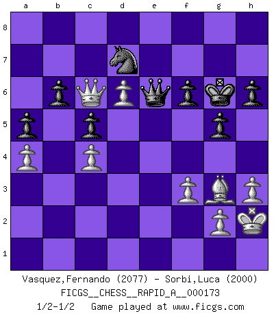 Last move : 1/2-1/2 2015 June 17 15:45:35 [Event "FICGS__CHESS__RAPID_A__000173"] [Site "FICGS"] [Date "2015.03.04"] [Round "1"] [White "Vasquez,Fernando"] [Black "Sorbi,Luca"] [Result "1/2-1/2"] [WhiteElo "2077"] [BlackElo "2000"] 1.e4 e5 2.Nf3 Nf6 3.Nxe5 d6 4.Nf3 Nxe4 5.d4 d5 6.Bd3 Nc6 7.O-O Be7 8.c4 Nb4 9.Be2 O-O 10.Nc3 Bf5 11.a3 Nxc3 12.bxc3 Nc6 13.Re1 Re8 14.cxd5 Qxd5 15.Bf4 Rac8 16.Bd3 Qd7 17.Rb1 b6 18.d5 Bxd3 19.Qxd3 Bf6 20.c4 Ne7 21.h3 Ng6 22.Bg3 h6 23.Nd4 Bxd4 24.Qxd4 c6 25.d6 Nf8 26.a4 Rxe1+ 27.Rxe1 Re8 28.Ra1 Ne6 29.Qb2 Rb8 30.Rb1 a5 31.Re1 c5 32.Qc2 Qc6 33.Qd1 Re8 34.Re3 Qd7 35.Qd5 Nf8 36.Rb3 Qd8 37.Be5 Nd7 38.Re3 Kf8 39.Bf4 Rxe3 40.Bxe3 Qe8 41.Bd2 Kg8 42.Qc6 Qe6 43.f3 f6 44.Bf4 g5 45.Bg3 Kf7 46.Kh2 Kg6 1/2-1/2 Petrov : Classical attack Kingside Castling by player White (move 7) Kingside Castling by player Black (move 9) This chess game ended in a draw. Follow this game move after move (download)Fischer is completely natural. He plays no roles. He's like a child. Very, very simple. (Zita Rajcsanyi) Als ich elf wurde, wurde ich einfach gut. (Robert James Fischer) El Ajedrez lo es todo: arte, ciencia y deporte. (Anatoly Karpov) La tactique, c'est ce que vous faites quand il y a quelque chose à faire; la stratégie, c'est ce que vous faites quand il n'y a rien à faire. (Savielli Tartacower) It is not enough to be a good player... you must also play well. (Siegbert Tarrasch)