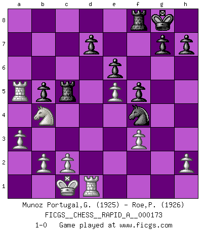 Last move : 1-0 2015 May 18 22:36:4 [Event "FICGS__CHESS__RAPID_A__000173"] [Site "FICGS"] [Date "2015.03.04"] [Round "1"] [White "Munoz Portugal,Guillermo"] [Black "Roe,Philip"] [Result "1-0"] [WhiteElo "1925"] [BlackElo "1926"] 1.e4 c5 2.Nc3 Nc6 3.Nge2 e6 4.d4 cxd4 5.Nxd4 a6 6.Be2 Qc7 7.f4 b5 8.Nxc6 Qxc6 9.Bf3 Bb7 10.Be3 Rc8 11.Qd4 Qc4 12.a3 Qxd4 13.Bxd4 f6 14.O-O-O Bc5 15.Bxc5 Rxc5 16.Rd6 Ne7 17.Rhd1 Bc6 18.Na2 f5 19.e5 Bxf3 20.gxf3 Nd5 21.Rxa6 O-O 22.Nb4 Nxf4 23.Ra5 1-0 This chess game has been lost on time (started : 2015.03.04 10:33:7) Sicilian : chameleon variation Queenside Castling by player White (move 14) Kingside Castling by player Black (move 21) Player White won this chess game. Follow this game move after move (download)Chess is as much a mystery as women. (Purdy) Ein Schachgenie ist jemand der verdammt gut Schach spielt. (Jonathan Levitt) ¿Se han dado cuenta de que Fischer casi nunca ha tenido piezas malas? El las intercambia y las piezas malas se quedan con sus oponenets. (Yuri Balashov) Les échecs sont un jeu par leur forme, un art par leur essence et une science par sa difficulté d'acquisition. Ils peuvent vous procurer autant de plaisir qu'un bon livre ou une belle musique, mais vous n'aurez une réelle joie que si vous arrivez à bien jouer. (Tigran Petrosian) Tomorrow's what you make of it. (Horatio Caine, C.S.I. Miami)