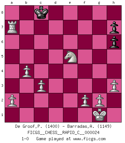 Last move : 1-0 2007 March 25 15:3:17 [Event "FICGS__CHESS__RAPID_C__000024"] [Site "FICGS"] [Date "2007.03.03"] [Round "1"] [White "De Groof,Pieter"] [Black "Barradas,Anderson"] [Result "1-0"] [WhiteElo "1400"] [BlackElo "1149"] 1.e4 e5 2.Bc4 Nf6 3.d3 d5 4.exd5 Nxd5 5.Nf3 Bg4 6.h3 Bxf3 7.Qxf3 c6 8.O-O Be7 9.Re1 Bf6 10.Nc3 Qa5 11.Bxd5 cxd5 12.Bh6 Nc6 13.Nxd5 O-O-O 14.Nxf6 gxh6 15.Qf5+ Kb8 16.c3 Qc7 17.Re3 Ne7 18.Qxe5 Qxe5 19.Rxe5 Ng6 20.Re3 Rd6 21.Ne4 Re6 22.Rae1 Rhe8 23.Nd6 Nf4 24.Nxe8 Rxe3 25.Rxe3 Kc8 26.Rf3 Ng6 27.Rxf7 Kd8 28.Nd6 Ne5 29.Nxb7+ Ke8 30.Nd6+ Kd8 31.Rxa7 Nxd3 32.b4 Ne5 33.Nf7+ Kc8 34.Nxe5 1-0 Bishop's Opening : Berlin defense Kingside Castling by player White (move 8) Queenside Castling by player Black (move 13) Player White won this chess game. Follow this game move after move (download)Chess holds its master in its own bonds, shackling the mind and brain so that the inner freedom of the very strongest must suffer. (Albert Einstein) Pläne sind die Träume des Verständigen. (Ernst Freiherr von Feuchtersleben) Bendita sea la memoria de aquel que dio al mundo este juego inmortal. (A. G. Gardiner) Le joueur d'Echecs qui veut atteindre le top est obligé de développer son propre credo créatif. Alexeï Stepanovicth Souétine. Il est facile d'écrire des livres ! Ce qui est difficile, c'est de jouer ! (Alexeï Stepanovicth Souétine) It's only after you lost everything, Tyler says, that you're free to do anything. (Chuck Palahniuk, Fight Club)