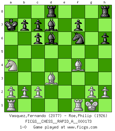 Last move : 1-0 2015 May 25 11:12:17 [Event "FICGS__CHESS__RAPID_A__000173"] [Site "FICGS"] [Date "2015.03.04"] [Round "1"] [White "Vasquez,Fernando"] [Black "Roe,Philip"] [Result "1-0"] [WhiteElo "2077"] [BlackElo "1926"] 1.e4 e5 2.Nf3 Nc6 3.d4 exd4 4.Nxd4 Bc5 5.Nxc6 Qf6 6.Qd2 dxc6 7.Nc3 Bd7 8.Bd3 O-O-O 9.O-O h6 10.Na4 Bd6 11.Qe3 Kb8 12.f4 g5 13.e5 gxf4 14.Qxa7+ Kxa7 15.exf6 Nxf6 16.Bxf4 1-0 This chess game has been lost on time (started : 2015.03.04 10:33:7) Scotch game Queenside Castling by player Black (move 8) Kingside Castling by player White (move 9) Player White won this chess game. Follow this game move after move (download)The most important feature of the Chess position is the activity of the pieces. This is absolutely fundamental in all phases of the game: Opening, Middlegame and especially Endgame. The primary constraint on a piece's activity is the Pawn structure. (Michael Stean) Der zweitbeste Zug ist oft der einzig richtige. (Savielly Grigorievitsch Tartakower) ¡Examina movidas que hagan daño! Un buen ojo for movidas desvastantes es mucho mas importante que el conocimiento de principios estratégicos. (Purdy) Si rien de grave n'est détecté lors de l'analyse d'une position, on joue alors le coup. Seconde règle de Blumenfeld. There are two kinds of tragedy in this world, one is not getting what you want and the other is getting. (Lord of war)