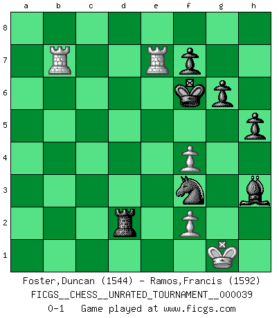 Last move : 0-1 2015 April 22 21:19:43 [Event "FICGS__CHESS__UNRATED_TOURNAMENT__000039"] [Site "FICGS"] [Date "2015.03.05"] [Round "1"] [White "Foster,Duncan"] [Black "Ramos,Francis"] [Result "0-1"] [WhiteElo "1544"] [BlackElo "1592"] 1.e4 c5 2.a3 d6 3.b4 cxb4 4.axb4 Nf6 5.Nc3 g6 6.g3 Bg7 7.Bg2 O-O 8.Nge2 Nbd7 9.O-O a6 10.h3 Rb8 11.b5 Nc5 12.d4 Ne6 13.Qd3 Qc7 14.Be3 Bd7 15.bxa6 bxa6 16.e5 dxe5 17.dxe5 Qxe5 18.Rxa6 Nc5 19.Bxc5 Qxc5 20.Rfa1 Be6 21.R1a5 Qc4 22.Qd2 Rfd8 23.Qe3 h5 24.Ra7 Rb2 25.Rc5 Qb4 26.Rb5 Rb1+ 27.Kh2 Nd5 28.Rxb4 Nxe3 29.Rxb1 Nxc2 30.Rxe7 Rd2 31.Bf3 Bxc3 32.Rb8+ Kg7 33.R8b7 Kf6 34.Rec7 Be5 35.Re7 Ne1 36.Nf4 Nxf3+ 37.Kg2 Bxf4 38.gxf4 Nh4+ 39.Kf1 Bxh3+ 40.Kg1 Nf3+ 0-1 Sicilian defense Kingside Castling by player Black (move 7) Kingside Castling by player White (move 9) Player Black won this chess game. Follow this game move after move (download)One of these modest little moves may be more embarrassing to your opponent than the biggest threat. (Siegbert Tarrasch) Alle offensichtlichen Züge sehen nach dem Spiel in der Analyse verdächtig aus. (Viktor Kortschnoi) Un mal plan es mejor que no tener ningún plan. (Frank Marshall) On a dit que l'homme se distingue de l'animal par le fait qu'il achète plus de livres qu'il ne peut en lire. Je voudrais suggérer qu'inclure à la liste des livres quelques livres d'échecs rendrait la distinction manifeste. (Edward Lasker) Just because you do not take an interest in politics doesn't mean politics won't take an interest in you. (Pericles 430 B.C.)