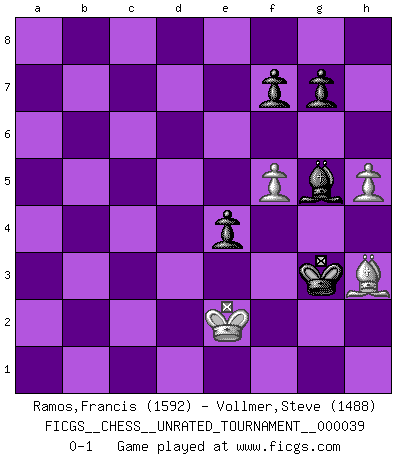 Last move : 0-1 2015 April 25 17:43:43 [Event "FICGS__CHESS__UNRATED_TOURNAMENT__000039"] [Site "FICGS"] [Date "2015.03.05"] [Round "1"] [White "Ramos,Francis"] [Black "Vollmer,Steve"] [Result "0-1"] [WhiteElo "1592"] [BlackElo "1488"] 1.e4 c5 2.Nf3 e6 3.d4 cxd4 4.Nxd4 Nc6 5.Nb5 d6 6.c4 Be7 7.N1c3 Nf6 8.Bf4 e5 9.Bg5 a6 10.Na3 O-O 11.Nc2 Be6 12.Bxf6 Bxf6 13.Nd5 Be7 14.Bd3 Rb8 15.Nce3 Nd4 16.Nf5 Nxf5 17.exf5 Bxd5 18.cxd5 Qb6 19.b3 Rbc8 20.O-O Rc5 21.Be4 Qb4 22.Qf3 Rc3 23.Qg4 h5 24.Qe2 Rfc8 25.a3 Qxb3 26.Rab1 Qxa3 27.Rxb7 Bf6 28.Qxh5 R3c7 29.Rxc7 Rxc7 30.g4 Rc1 31.Bg2 Rxf1+ 32.Bxf1 Qc1 33.h4 Qh6 34.Bxa6 Qxh5 35.gxh5 Bxh4 36.Kg2 Kh7 37.Be2 Kh6 38.Bg4 Kg5 39.f3 Kf4 40.Kf1 Ke3 41.Kg2 Kd4 42.Kh3 Bf6 43.Kg3 Kxd5 44.Kf2 Bg5 45.Ke2 Kd4 46.Bh3 d5 47.Bg2 e4 48.fxe4 dxe4 49.Bh3 Ke5 50.Bg4 Kf4 51.Bh3 Kg3 0-1 Sicilian, Szen (`anti-Taimanov') variation Kingside Castling by player Black (move 10) Kingside Castling by player White (move 20) 10 pieces endgame at move 48 : White KBPPP , Black KBPPP WHITE : King + 1 Bishop 3 Pawns BLACK : King + 1 Bishop 3 Pawns 9 pieces endgame at move 48 : White KBPP , Black KBPPP WHITE : King + 1 Bishop 2 Pawns BLACK : King + 1 Bishop 3 Pawns Player Black won this chess game. Follow this game move after move (download)Combinations have always been the most intriguing aspect of Chess. The masters look for them, the public applauds them, the critics praise them. It is because combinations are possible that Chess is more than a lifeless mathematical exercise. They are the poetry of the game; they are to Chess what melody is to music. They represent the triumph of mind over matter. (Reuben Fine) Schach ist wie eine schöne Frau, zu der wir ständig zurückkehren, gleichviel, wie oft sie uns zurückweist. (Anonymous) La partida mas dura de ganar es una partida ganada. (Emanuel Lasker) Je ne suis pas le dernier à jouer lâchement des coups douteux pendant le zeïtnot de l'adversaire pour l'achever: en effet les coups qui font le plus peur sont ceux que l'on ne comprend pas. Je me fais souvent peur quand je joue. (Un professeur anonyme) All politicians must be presumed guilty until they are proven innocent. (Dinesh De Silva)