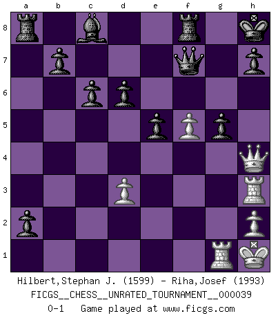 Last move : 0-1 2015 March 17 16:15:50 [Event "FICGS__CHESS__UNRATED_TOURNAMENT__000039"] [Site "FICGS"] [Date "2015.03.05"] [Round "1"] [White "Hilbert,Stephan J."] [Black "Riha,Josef"] [Result "0-1"] [WhiteElo "1599"] [BlackElo "1993"] 1.e4 d6 2.d4 Nf6 3.Bd3 e5 4.Nf3 exd4 5.Nxd4 Nbd7 6.O-O Be7 7.Nc3 O-O 8.Nf5 Nc5 9.Nxe7+ Qxe7 10.Bg5 Qe5 11.Bxf6 Qxf6 12.Nd5 Qd8 13.Qh5 c6 14.e5 Nxd3 15.Nf6+ gxf6 16.cxd3 fxe5 17.f4 f6 18.f5 Qb6+ 19.Kh1 Qxb2 20.Rae1 Qxa2 21.Re3 Kh8 22.Rg3 a5 23.Rh3 Qf7 24.Qh4 a4 25.g4 a3 26.Rg1 a2 27.g5 fxg5 0-1 King's pawn Opening Kingside Castling by player White (move 6) Kingside Castling by player Black (move 7) Player Black won this chess game. Follow this game move after move (download)The tactician knows what to do when there is something to do; whereas the strategian knows what to do when there is nothing to do. (Gerald Abrahams) Schach verlangt totale Konzentration. (Robert James Fischer) En el Ajedrez, tal como es jugado por los Maestros, practicamente la suerte es eliminada. (Emanuel Lasker) Votre seul travail dans les ouvertures est d'obtenir un milieu de partie jouable. (Lajos Portish) Some people are so afraid to die that they never begin to live. (Henry Van Dyke)