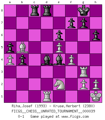 Last move : 0-1 2015 March 15 17:18:10 [Event "FICGS__CHESS__UNRATED_TOURNAMENT__000039"] [Site "FICGS"] [Date "2015.03.05"] [Round "1"] [White "Riha,Josef"] [Black "Kruse,Herbert"] [Result "0-1"] [WhiteElo "1993"] [BlackElo "2380"] 1.d4 d5 2.c4 c6 3.Nf3 Nf6 4.Nc3 a6 5.e3 e6 6.Bd3 dxc4 7.Bxc4 b5 8.Bd3 Nbd7 9.O-O Bb7 10.e4 c5 11.Bg5 cxd4 12.Nxd4 Ne5 13.Be2 Be7 14.Re1 O-O 15.Nf3 Ng6 16.Bd3 h6 17.Bxf6 Bxf6 18.Re3 Rc8 19.Qb3 Ne5 20.Nxe5 Bxe5 21.Ne2 Qc7 22.Rh3 Rfd8 23.Rf1 Qa5 24.f4 Bd4+ 25.Kh1 Qd2 26.a4 b4 27.Rb1 a5 28.Rg3 Bc3 29.Rd1 Qxb2 30.Qxb2 Bxb2 31.e5 Bd4 32.Bb5 Be4 0-1 QGD Slav : 4.Nc3 Kingside Castling by player White (move 9) Kingside Castling by player Black (move 14) Player Black won this chess game. Follow this game move after move (download)At this time Fischer is simply a level above all the best Chessplayers in the world. (John Jacobs) Kasparov ist eine Art Monster mit hundert Augen, denen auch nicht das Geringste entgeht. (Tony Miles) Botvinnik trataba de restarle el misterio al Ajedrez, siempre relacionandolo a situaciones de la vida ordinaria. El gustaba de llamar al Ajedrez un típico problema inexacto similar a aquellos de los cuales la gente siempre tiene que enfrentarse en la vida cotidiana. (Garry Kasparov) La solitude du joueur d'Echecs à l'approche du mat est semblable à celle du condamné. (Francis Szpiner) When you've done things right people won't know you've done anything at all. (Futurama)