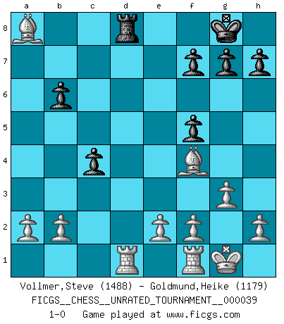 Last move : 1-0 2015 March 19 18:56:54 [Event "FICGS__CHESS__UNRATED_TOURNAMENT__000039"] [Site "FICGS"] [Date "2015.03.05"] [Round "1"] [White "Vollmer,Steve"] [Black "Goldmund,Heike"] [Result "1-0"] [WhiteElo "1488"] [BlackElo "1179"] 1.d4 d5 2.Nf3 Nf6 3.g3 Bf5 4.Bg2 e6 5.O-O c5 6.dxc5 Bxc5 7.c4 O-O 8.Nc3 dxc4 9.Ne5 Qc7 10.Bf4 Bd6 11.Nb5 Qb6 12.Nxd6 Nbd7 13.Nxd7 Nxd7 14.Nxf5 exf5 15.Qxd7 Rfd8 16.Qxb7 Qd4 17.Rad1 Qb6 18.Qxb6 axb6 19.Bxa8 1-0 Queen's pawn game Kingside Castling by player White (move 5) Kingside Castling by player Black (move 7) Player White won this chess game. Follow this game move after move (download)You need not play well - just help your opponent to play badly. (Genrikh Chepukaitis) Ich hatte meine größten Erfolge, als ich 47 Jahre alt war. Kasparow war noch nicht mal 42 und hat das Schach schon im Stich gelassen. (Viktor Kortschnoi) Cuando no sepas que mover, espera por una idea que se le venga a la la cabeza de tu oponente. Tenlo por seguro de que esa idea estará incorrecta. (Siegbert Tarrasch) Les Echecs, c'est l'art de la guerre sans les charniers, c'est la résurrection des morts tombés au champ d'honneur, l'espoir perpétuel, la suprématie de l'intelligence sur la force, la culture de l'esprit. (F. Szpiner) War is the child of passion, passion is the child of narcissism and narcissism is the child. (...) Another game ? (Thibault de Vassal)