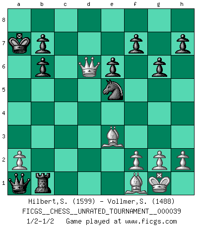 Last move : 1/2-1/2 2015 March 16 10:39:7 [Event "FICGS__CHESS__UNRATED_TOURNAMENT__000039"] [Site "FICGS"] [Date "2015.03.05"] [Round "1"] [White "Hilbert,Stephan J."] [Black "Vollmer,Steve"] [Result "1/2-1/2"] [WhiteElo "1599"] [BlackElo "1488"] 1.e4 c5 2.b4 e6 3.bxc5 Bxc5 4.d4 Bb6 5.c3 Ne7 6.Bd3 Nbc6 7.Nf3 d6 8.Ng5 Bd7 9.Qh5 Ng6 10.e5 Ncxe5 11.dxe5 Nxe5 12.O-O g6 13.Qh6 Qf6 14.Ne4 Qe7 15.Be2 Qf8 16.Nf6+ Kd8 17.Qh4 Kc7 18.Na3 Rc8 19.Bh6 Qd8 20.Rfd1 Bc6 21.Nb5+ Bxb5 22.Bxb5 Kb8 23.Bf4 Qc7 24.Rxd6 Qxc3 25.Nd7+ Ka8 26.Nxb6+ axb6 27.Be3 Qxa1+ 28.Bf1 Rc4 29.Rd8+ Ka7 30.Qe7 Rxd8 31.Qxd8 Rb4 32.Qd6 Rb1 1/2-1/2 Sicilian : wing gambit Kingside Castling by player White (move 12) This chess game ended in a draw. Follow this game move after move (download)Your body has to be in top condition. Your Chess deteriorates as your body does. You can't separate body from mind. (Bobby Fischer) In der Schule lernt man nichts. Es ist nur Zeitverschwendung. (Robert James Fischer) En posiciones complicadas, Bobby Fischer pocas veces tuvo que temer de cualquiera. (Paul Keres) Toutes choses étant égales, c'est la conviction qui gagne. Alliée à une volonté de vaincre, elle sert de détonateur, suscite des idées, disperse les doutes et aide à penser clairement. (Robert Fischer) Good luck. You're gonna need it. (Han Solo in Star Wars ep.6)