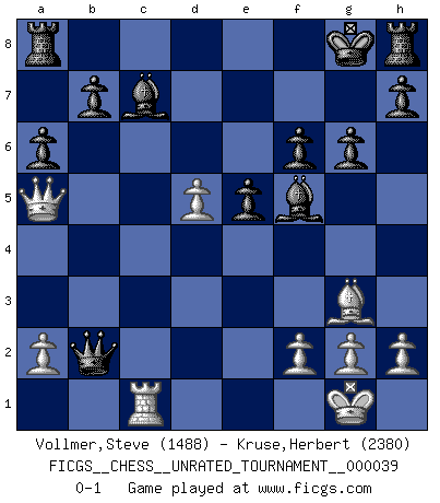 Last move : 0-1 2015 April 18 11:25:9 [Event "FICGS__CHESS__UNRATED_TOURNAMENT__000039"] [Site "FICGS"] [Date "2015.03.05"] [Round "1"] [White "Vollmer,Steve"] [Black "Kruse,Herbert"] [Result "0-1"] [WhiteElo "1488"] [BlackElo "2380"] 1.d4 c5 2.dxc5 e6 3.e4 Bxc5 4.Nf3 Nf6 5.Bd3 Nc6 6.Nc3 a6 7.O-O Qc7 8.Qe2 Ng4 9.Nd5 exd5 10.exd5 Ne7 11.Bg5 f6 12.Bh4 d6 13.Rfe1 Ne5 14.Nxe5 dxe5 15.Qh5+ g6 16.Qh6 Kf7 17.Rad1 Nf5 18.Bxf5 Bxf5 19.Bg3 Bf8 20.Qd2 Qxc2 21.Qa5 Bd6 22.Rc1 Qxb2 23.Rc7+ Kg8 24.Rec1 Bxc7 0-1 Old Benoni defense Kingside Castling by player White (move 7) Player Black won this chess game. Follow this game move after move (download)The game of Chess is not merely an idle amusement; several very valuable qualities of the mind are to be acquired and strengthened by it, so as to become habits ready on all occasions; for life is a kind of Chess. (Benjamin Franklin) Die Neutralität betrachte ich als eine schwere Krankheit. (Viktor Kortschnoi) La partida mas dura de ganar es una partida ganada. (Emanuel Lasker) Mais l'homme est une créature légère et illogique : semblable au joueur d'échecs, il n'aime que le processus du but à atteindre, non le but lui-même. (Dostoïevsky) No man has ever achieved immortality in his own life time. (Unknown)