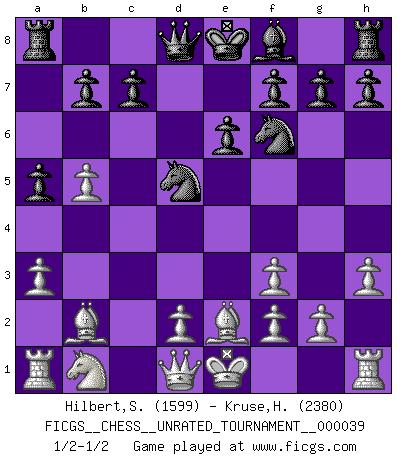 Last move : 1/2-1/2 2015 March 6 19:59:31 [Event "FICGS__CHESS__UNRATED_TOURNAMENT__000039"] [Site "FICGS"] [Date "2015.03.05"] [Round "1"] [White "Hilbert,Stephan J."] [Black "Kruse,Herbert"] [Result "1/2-1/2"] [WhiteElo "1599"] [BlackElo "2380"] 1.b4 d5 2.Bb2 Bg4 3.Nf3 Nd7 4.h3 Bxf3 5.exf3 Ngf6 6.c4 dxc4 7.Bxc4 e6 8.a3 a5 9.b5 Nb6 10.Be2 Nbd5 1/2-1/2 Polish (Sokolsky) opening This chess game ended in a draw. Follow this game move after move (download)I thought the most common mistake [in chess] was the first one: Learning the game :P (Garvin Gray, FICGS forum) Ich habe die Schachforschung dermaßen betrieben, dass sie auf eine wissenschaftliche Basis gestellt wurde. (Mikhail Moiseyevich Botvinik) El Ajedrez no es una pizca de inferior al violín, y tenemos un gran número de violinistas profesionales. (Mikhail Botvinnik) La menace est plus forte que l'exécution. (Aaron Nimzovitch) Mac users swear by their computers. PC users swear at their computers. (Author unknown)