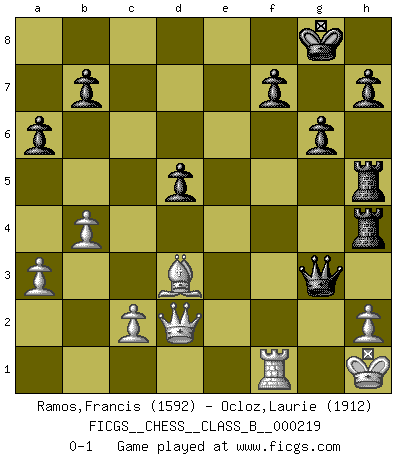 Last move : 0-1 2015 April 23 15:15:16 [Event "FICGS__CHESS__CLASS_B__000219"] [Site "FICGS"] [Date "2015.03.05"] [Round "1"] [White "Ramos,Francis"] [Black "Ocloz,Laurie"] [Result "0-1"] [WhiteElo "1592"] [BlackElo "1912"] 1.e4 c5 2.Nf3 d6 3.d4 cxd4 4.Nxd4 Nf6 5.Nc3 a6 6.Be3 e5 7.Nb3 Be6 8.Be2 Be7 9.O-O Nbd7 10.f4 exf4 11.Bxf4 O-O 12.Nd4 Qb6 13.a3 Nc5 14.Kh1 Nfxe4 15.Nxe4 Nxe4 16.Bf3 d5 17.b4 Rac8 18.Be5 Rfe8 19.Nxe6 Qxe6 20.Bd4 Bd6 21.Bh5 g6 22.Bf3 Be5 23.Re1 Rc4 24.Bxe4 Rxd4 25.Bd3 Rh4 26.g3 Qh3 27.Qd2 Qxg3 28.Rxe5 Rxe5 29.Rf1 Reh5 0-1 Sicilian : Najdorf, Byrne (English) attack Kingside Castling by player White (move 9) Kingside Castling by player Black (move 11) Player Black won this chess game. Follow this game move after move (download)By the beauty of his games, the clarity of his play, and the brilliance of his ideas, Fischer made himself an artist of the same stature as Brahms, Rembrandt, and Shakespeare. (David Levy) Der vorletzte Fehler gewinnt. (Savielly Grigorievitsch Tartakower) Haz el enroque temprano y seguido. (Rob Sillars) Le joueur d'Echecs qui veut atteindre le top est obligé de développer son propre credo créatif. Alexeï Stepanovicth Souétine. Il est facile d'écrire des livres ! Ce qui est difficile, c'est de jouer ! (Alexeï Stepanovicth Souétine) The meaning of life is that it is to be lived, and it is not to be traded and conceptualized and squeezed into a pattern of systems. (Bruce Lee)