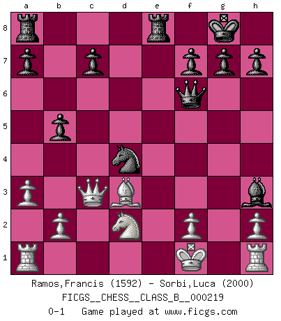 Last move : 0-1 2015 April 20 16:0:45 [Event "FICGS__CHESS__CLASS_B__000219"] [Site "FICGS"] [Date "2015.03.05"] [Round "1"] [White "Ramos,Francis"] [Black "Sorbi,Luca"] [Result "0-1"] [WhiteElo "1592"] [BlackElo "2000"] 1.e4 e5 2.Nf3 Nf6 3.Nxe5 d6 4.Nf3 Nxe4 5.d4 d5 6.Bd3 Nc6 7.c4 Bb4+ 8.Bd2 Nxd2 9.Nbxd2 dxc4 10.Bxc4 O-O 11.a3 Re8+ 12.Kf1 Ba5 13.Qb3 Qf6 14.Qd3 Bf5 15.Qb3 Bxd2 16.Nxd2 Nxd4 17.Qc3 b5 18.g4 Bxg4 19.Bd3 Bh3+ 0-1 Petrov : Classical attack Kingside Castling by player Black (move 10) Player Black won this chess game. Follow this game move after move (download)Life is like a game of Chess, changing with each move. (Chinese proverb) Wenn ich Weiß habe gewinne ich weil ich Weiß habe, wenn ich Schwarz habe gewinne ich weil ich Bogoljubov bin. (Efim Bogoljubov) Fischer es el jugador mas fuerte del mundo. De hecho, el jugador mas fuerte que jamas haya existido. (Larry Evans) Même si vous avez un bon coup à faire, regardez toujours s'il n'y en a pas un qui lui soit préférable. (Pedro Damiano) For peace of mind, resign as general manager of the universe. (Douglas Adams)