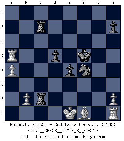 Last move : 0-1 2015 July 13 17:34:10 [Event "FICGS__CHESS__CLASS_B__000219"] [Site "FICGS"] [Date "2015.03.05"] [Round "1"] [White "Ramos,Francis"] [Black "Rodriguez Perez,Rene"] [Result "0-1"] [WhiteElo "1592"] [BlackElo "1983"] 1.e4 e6 2.d4 d5 3.Nc3 Nf6 4.e5 Nfd7 5.f4 c5 6.Be3 Nc6 7.Nf3 cxd4 8.Nxd4 Bc5 9.Qd2 Nxd4 10.Bxd4 Bxd4 11.Qxd4 Qb6 12.Qxb6 Nxb6 13.a4 a5 14.Nb5 Rb8 15.c4 Ke7 16.c5 Nd7 17.Rc1 g5 18.g3 Rg8 19.Kf2 gxf4 20.gxf4 f6 21.exf6+ Nxf6 22.Bd3 Nh5 23.f5 Nf4 24.Bf1 e5 25.Nd6 b6 26.Nxc8+ Rbxc8 27.c6 Kf6 28.c7 Rg7 29.Rc6+ Kxf5 30.Rxb6 e4 31.Rb5 R8xc7 32.Rxa5 Rc2+ 33.Ke1 Rgc7 0-1 French : Steinitz variation Player Black won this chess game. Follow this game move after move (download)Chess is a beautiful mistress. (Bent Larsen) Ein unbeabsichtigtes Patt ist der Gipfel der Dummheit. (Anonymous) Nunca nadie ha ganado una partida de Ajedrez rindiendose. (Unknown) Si je n'étais pas joueur d'échecs, je serais le meilleur dans quelque chose d'autre. (Anatoli Karpov) I teach you to lie, cheat and steal, and as soon as my back's turned you wait in line ? (Gregory House, House M.D.)