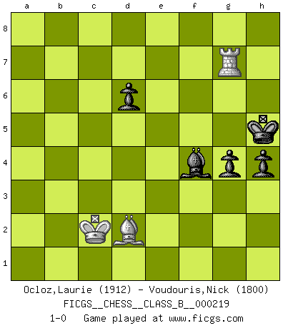 Last move : 1-0 2015 May 19 9:57:53 [Event "FICGS__CHESS__CLASS_B__000219"] [Site "FICGS"] [Date "2015.03.05"] [Round "1"] [White "Ocloz,Laurie"] [Black "Voudouris,Nick"] [Result "1-0"] [WhiteElo "1912"] [BlackElo "1800"] 1.e4 c5 2.Nf3 d6 3.d4 cxd4 4.Nxd4 Nf6 5.Nc3 a6 6.Be3 e5 7.Nb3 Be7 8.f3 Be6 9.Qd2 Nbd7 10.g4 b5 11.O-O-O O-O 12.g5 b4 13.Ne2 Ne8 14.f4 a5 15.f5 a4 16.Nbd4 b3 17.Kb1 exd4 18.Nxd4 bxc2+ 19.Nxc2 Bb3 20.axb3 axb3 21.Na3 Ne5 22.h4 Ra5 23.Qb4 Qa8 24.Bb6 Ra4 25.Qxb3 Qxe4+ 26.Nc2 Ra8 27.Qd5 Qxd5 28.Rxd5 Rb8 29.Ba5 f6 30.Nd4 g6 31.Ne6 Rf7 32.Rb5 Rxb5 33.Bxb5 Ng7 34.Rc1 gxf5 35.Rc8+ Bf8 36.Nd8 fxg5 37.Nxf7 Kxf7 38.hxg5 Be7 39.Bf1 Bxg5 40.b4 Ne6 41.b5 Nc5 42.b6 Ke6 43.Rc7 h5 44.b7 Nxb7 45.Rxb7 h4 46.Kc2 Ng4 47.Bd2 Kf6 48.Bc3+ Kg6 49.Rg7+ Kh5 50.Bh3 Bf4 51.Bxg4+ fxg4 52.Bd2 1-0 Sicilian : Najdorf, Byrne (English) attack Queenside Castling by player White (move 11) Kingside Castling by player Black (move 11) 10 pieces endgame at move 45 : White KRBB , Black KBNPPP WHITE : King + 1 Rook 2 Bishops BLACK : King + 1 Bishop 1 Knight 3 Pawns 9 pieces endgame at move 51 : White KRBB , Black KBPPP WHITE : King + 1 Rook 2 Bishops BLACK : King + 1 Bishop 3 Pawns 8 pieces endgame at move 51 : White KRB , Black KBPPP WHITE : King + 1 Rook 1 Bishop BLACK : King + 1 Bishop 3 Pawns Player White won this chess game. Follow this game move after move (download)The passion for playing Chess is one of the most unaccountable in the world. (H.G. Wells) Ein Gewinn durch eine ungenaue Kombination, sei sie auch noch so vorzeigbar, erfüllt mich mit Schaudern. (Wilhelm Steinitz) El jugador blanco perdió porque fallo en recordar la coreccta continuación y tuvo que pensar por sí mismo las movidas. (Siegbert Tarrasch) Ne tendez aucun piège pour le plaisir ! Ne jouez rien dans l'espoir que l'adversaire réagisse de façon stupide ! Prenez toujours pour acquis que l'adversaire va trouver le meilleur coup ! Ne jouez jamais de coup dans l'espoir que l'adversaire ne voie pas la menace ! Chacun de vos coups doit améliorer la position d'une façon ou d'une autre. Beta. Software undergoes beta testing shortly before it's released. Beta is latin for still doesn't work. (Anonymous)