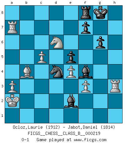 Last move : 0-1 2015 December 19 21:22:55 [Event "FICGS__CHESS__CLASS_B__000219"] [Site "FICGS"] [Date "2015.03.05"] [Round "1"] [White "Ocloz,Laurie"] [Black "Jabot,Daniel"] [Result "0-1"] [WhiteElo "1912"] [BlackElo "1814"] 1.e4 c5 2.Nf3 d6 3.d4 cxd4 4.Nxd4 Nf6 5.Nc3 g6 6.Be3 Bg7 7.f3 O-O 8.Qd2 Nc6 9.O-O-O Bd7 10.Kb1 Rc8 11.g4 Ne5 12.Be2 b5 13.Ncxb5 a6 14.Nc3 Nc4 15.Bxc4 Rxc4 16.h4 Qb8 17.h5 Rfc8 18.Ka1 Rxc3 19.bxc3 Qc7 20.Qe1 e5 21.Nb3 Ne8 22.hxg6 hxg6 23.Rd3 Bb5 24.c4 Qxc4 25.Rh2 Qc7 26.Rd1 Bd7 27.Na5 Ba4 28.g5 Qd7 29.Nb3 Bb5 30.Bc1 Qc7 31.Ba3 Qc3+ 32.Qxc3 Rxc3 33.Rf2 Bf8 34.Bb4 Rc4 35.a3 Rc8 36.Rg2 Be7 37.Na5 Ba4 38.R1d2 Kg7 39.c4 Kg8 40.Rg3 Rd8 41.Ka2 Ng7 42.Nb7 Rb8 43.Nxd6 Ne6 44.Rd5 Bxg5 45.Ra5 Bd1 46.Rxa6 Be3 47.Ra5 Nd4 48.Rh3 Bf4 49.Ra7 Be2 50.c5 Rf8 0-1 Sicilian : Dragon, Yugoslav attack, 7...O-O Kingside Castling by player Black (move 7) Queenside Castling by player White (move 9) Player Black won this chess game. Follow this game move after move (download)The battle for the ultimate truth will never be won. And that's why Chess is so fascinating. (Hans Kmoch) Die Jungen erwarten, dass Opa einfach umfällt. Dann aber kann Opa fünf Stunden lang Schach spielen und die jungen Gegner an die Wand drücken. (Viktor Kortschnoi) Existen dos clases de sacrificios: los correctos y los míos. (Mikhail Tal) Ce qui est bien, c'est d'avoir tout un tas de pièces en prise : l'adversaire ne peut en prendre qu'une à la fois. Cité par Thierry Audin. If only faces could talk... (Pat Summerall, Sportscaster during the Super Bowl)