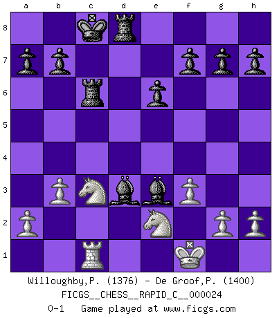 Last move : 0-1 2007 March 12 20:57:13 [Event "FICGS__CHESS__RAPID_C__000024"] [Site "FICGS"] [Date "2007.03.03"] [Round "1"] [White "Willoughby,Peter"] [Black "De Groof,Pieter"] [Result "0-1"] [WhiteElo "1376"] [BlackElo "1400"] 1.e4 d5 2.exd5 Nf6 3.d4 Bg4 4.f3 Bf5 5.Bb5+ c6 6.dxc6 Qa5+ 7.Nc3 Nxc6 8.d5 O-O-O 9.Bd2 Nxd5 10.Qe2 Ndb4 11.Bxc6 Nxc2+ 12.Kf2 Nxa1 13.Bb5 Nc2 14.Qc4+ Qc7 15.Bf4 Qxc4 16.Bxc4 Rd4 17.Nge2 Rxc4 18.Rd1 e6 19.b3 Rc6 20.Nb5 Bc5+ 21.Kf1 Rd8 22.Rc1 Bd3 23.Nbc3 Ne3+ 24.Bxe3 Bxe3 0-1 Scandinavian defense Queenside Castling by player Black (move 8) Player Black won this chess game. Follow this game move after move (download)Some sacrifices are sound; the rest are mine. (Mikhail Tal) Man gibt nur Pakete auf. (Paul Keres) Una buena ofensiva y una buena defensa, comienzan ambas con un buen desarrollo. (Bruce A. Moon) Les ravages du H expliquent la différence de niveau entre Tal et Thal [Abergel]. I'm extremely disappointed. I send you out for exciting, new designer drugs, you come back with tomato sauce. (Gregory House, House M.D.)