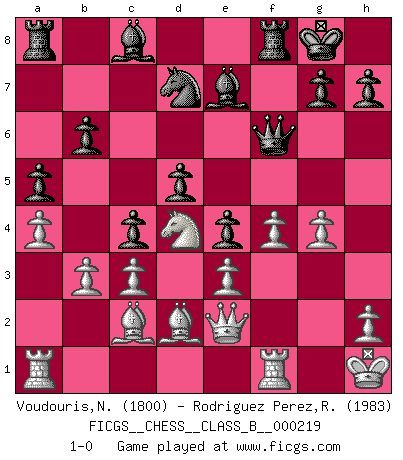 Last move : 1-0 2015 July 1 14:55:8 [Event "FICGS__CHESS__CLASS_B__000219"] [Site "FICGS"] [Date "2015.03.05"] [Round "1"] [White "Voudouris,Nick"] [Black "Rodriguez Perez,Rene"] [Result "1-0"] [WhiteElo "1800"] [BlackElo "1983"] 1.d4 e6 2.e3 d5 3.Bd3 c5 4.c3 Nf6 5.f4 Nc6 6.Nf3 Bd6 7.O-O O-O 8.Ne5 Qb6 9.Kh1 a5 10.a4 Be7 11.Nd2 Nd7 12.Ndf3 c4 13.Bc2 f6 14.Nxc6 Qxc6 15.Bd2 b6 16.g4 e5 17.dxe5 fxe5 18.Qe2 e4 19.Nd4 Qf6 20.b3 1-0 This chess game has been lost on time (started : 2015.03.05 21:1:29) Queen's pawn Kingside Castling by player White (move 7) Kingside Castling by player Black (move 7) Player White won this chess game. Follow this game move after move (download)I guess a certain amount of temperament is expected of Chess geniuses. (Ron Gross) Mit sehr nachdenklichem Gesicht schreitet Bobby durch den Turniersaal. Was ist passiert?, fragt Lombardy. Ich stehe schlecht, antwortet Fischer. Lombardy: Dann biete doch einfach Remis an. Fischer: So schlecht stehe ich nun auch wieder nicht! (Robert James Fischer) No es suficiente ser un buen jugador, se debe también de jugar bién. (Siegbert Tarrasch) Avec des compensations pour le matériel en plus... (Anonyme) Only sick music makes money today. (Friedrich Nietzsche)