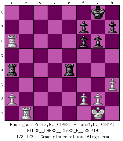 Last move : 1/2-1/2 2015 July 28 19:9:25 [Event "FICGS__CHESS__CLASS_B__000219"] [Site "FICGS"] [Date "2015.03.05"] [Round "1"] [White "Rodriguez Perez,Rene"] [Black "Jabot,Daniel"] [Result "1/2-1/2"] [WhiteElo "1983"] [BlackElo "1814"] 1.e4 c5 2.Nf3 d6 3.d4 cxd4 4.Qxd4 Nc6 5.Bb5 Bd7 6.Bxc6 Bxc6 7.c4 Nf6 8.Nc3 g6 9.O-O Bg7 10.Qd3 O-O 11.Nd4 Qb6 12.Rd1 Ng4 13.Qd2 Qc5 14.h3 Nf6 15.Qe2 Rac8 16.Rb1 a6 17.Nxc6 Qxc6 18.b3 b5 19.Nd5 Rfe8 20.Bg5 bxc4 21.Bxf6 Bxf6 22.Qxc4 Qxc4 23.Nxf6+ exf6 24.bxc4 Rxc4 25.Rxd6 R8xe4 26.Rxa6 Ra4 1/2-1/2 Sicilian, Chekhover variation Kingside Castling by player White (move 9) Kingside Castling by player Black (move 10) This chess game ended in a draw. Follow this game move after move (download)Adequate compensation for a sacrifice is having a sound combination leading to a winning position; adequate compensation for a blunder is having your opponent snatch defeat from the jaws of victory. (Bruce A. Moon) Modernes Schach sorgt sich zuviel um Dinge wie Bauernstruktur usw. Vergessen Sie das, Schachmatt beendet das Spiel! (Nigel Short) Al jugar al Ajedrez entonces, podemos aprender: Primero: Previsión... Segundo: Prudencia... Tercero: Cautela... Y al final, aprendemos del Ajedrez el hábito de no ser desanimados por apariencias malas presentes en el estado de nuestros asuntos, el hábito de la esperanza por una oportunidad favorable y la perseveración de los secretos de los recursos. (Benjamin Franklin) Le joueur d'Echecs qui veut atteindre le top est obligé de développer son propre credo créatif. Alexeï Stepanovicth Souétine. Il est facile d'écrire des livres ! Ce qui est difficile, c'est de jouer ! (Alexeï Stepanovicth Souétine) I live to kill Traxler counterattack. (Ilmars Cirulis)
