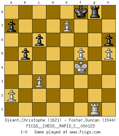 Last move : 1-0 2015 April 26 12:53:16 [Event "FICGS__CHESS__RAPID_C__000123"] [Site "FICGS"] [Date "2015.03.06"] [Round "1"] [White "Dikant,Christophe"] [Black "Foster,Duncan"] [Result "1-0"] [WhiteElo "1621"] [BlackElo "1544"] 1.d4 b6 2.Bf4 Bb7 3.e3 d6 4.Nd2 e6 5.Ngf3 h6 6.h4 g6 7.c3 Bg7 8.Bb5+ c6 9.Bc4 Ne7 10.Qb3 b5 11.Bxe6 fxe6 12.Qxe6 Bc8 13.Qxd6 Qxd6 14.Bxd6 Nd7 15.Ne4 Bf8 16.Ne5 Bg7 17.Nxd7 Bxd7 18.Bc5 Nf5 19.g4 Ne7 20.Nd6+ Kf8 21.f3 Kg8 22.e4 Kh7 23.Ke2 Rhf8 24.h5 g5 25.Nf5 Bxf5 26.Bxe7 Rfe8 27.gxf5 Rxe7 28.Kf2 Bf6 29.Rae1 Rd8 30.e5 Bxe5 31.dxe5 Rd2+ 32.Kg3 Rxb2 33.Rh2 Rxh2 34.Kxh2 Kg8 35.Kg3 Kf7 36.f4 gxf4+ 37.Kxf4 Re8 38.Rg1 Rg8 39.e6+ Kf8 40.e7+ 1-0 Queen's pawn : English defense Player White won this chess game. Follow this game move after move (download)Blessed be the memory of him who gave the world this immortal game. (A. G. Gardiner) Es ist nicht das erste mal, dass sich die FIDE dem Arabischen Geld gebeugt hat (über die FIDE WM 2004 in Lybien). (Larry Evans) Te sientas frente a un tablero y repentinamente tu corazón brinca. Tu mano tiembla al tomar una pieza y moverla. Pero lo que el Ajedrez te enseña es que tu debes permanecer ahí con calma y pensar de que si realmente es una buena idea o de que si hay otras ideas mejores. (Stanley Kubrick) Il a essayé de se convaincre qu'il pourrait empêcher toutes les erreurs et ne jamais perdre. L'horreur ! Gary Kasparov au sujet de Robert Fischer. Tomorrow's what you make of it. (Horatio Caine, C.S.I. Miami)