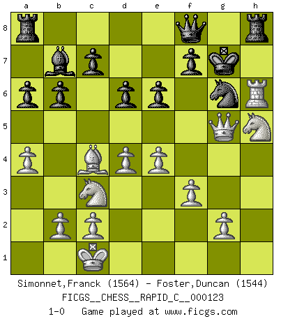Last move : 1-0 2015 March 18 18:46:9 [Event "FICGS__CHESS__RAPID_C__000123"] [Site "FICGS"] [Date "2015.03.06"] [Round "1"] [White "Simonnet,Franck"] [Black "Foster,Duncan"] [Result "1-0"] [WhiteElo "1564"] [BlackElo "1544"] 1.d4 b6 2.e4 Bb7 3.f3 g6 4.Bc4 e6 5.Ne2 Bg7 6.Nbc3 a6 7.a4 d6 8.Be3 Ne7 9.Qd2 O-O 10.Bh6 Nd7 11.h4 Nf6 12.O-O-O Kh8 13.h5 Nxh5 14.Rxh5 gxh5 15.Bxg7+ Kxg7 16.Nf4 Ng6 17.Nxh5+ Kh8 18.Qh6 Rg8 19.Rh1 Qf8 20.Qg5 h6 21.Nf6 Kg7 22.Rxh6 Rh8 23.Nh5+ 1-0 Queen's pawn : English defense Kingside Castling by player Black (move 9) Queenside Castling by player White (move 12) Player White won this chess game. Follow this game move after move (download)Good offense and good defense both begin with good development. (Bruce A. Moon) Ich könnte leicht behaupten: Ja,ja, Leonid Breschnew wollte nicht, daß ich Weltmeister werde. In der Tat war die Sache komplizierter. (Viktor Kortschnoi) El arma más poderosa en el Ajedrez, es tener la próxima movida. (David Bronstein) Avant la finale, les dieux ont créé le milieu de partie. (Tarrasch) In my experience, there's no such thing as luck. (Obi-Wan Kenobi in Star Wars ep.4)