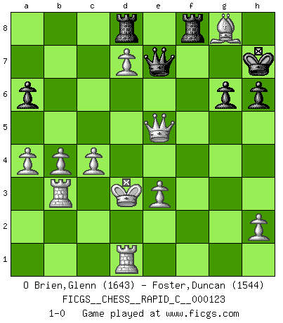 Last move : 1-0 2015 April 22 10:21:31 [Event "FICGS__CHESS__RAPID_C__000123"] [Site "FICGS"] [Date "2015.03.06"] [Round "1"] [White "O Brien,Glenn"] [Black "Foster,Duncan"] [Result "1-0"] [WhiteElo "1643"] [BlackElo "1544"] 1.e4 b6 2.d4 Bb7 3.Bd3 g6 4.Nf3 Bg7 5.O-O d6 6.Nc3 a6 7.Bc4 e6 8.Bg5 Ne7 9.d5 e5 10.Bxe7 Qxe7 11.Qd2 O-O 12.Be2 Nd7 13.Rfd1 Nc5 14.b4 Nd7 15.a4 h6 16.Qe3 c5 17.dxc6 Bxc6 18.Nd2 Kh7 19.Nc4 d5 20.exd5 Bb7 21.Nxb6 Nxb6 22.Qxb6 e4 23.Ra3 Rfb8 24.d6 Qe6 25.Qc7 Be5 26.Bc4 Qf6 27.Bxf7 Kh8 28.Rb3 e3 29.fxe3 Bxg2 30.Kxg2 Qg5+ 31.Kf1 Rf8 32.Ke2 Qg2+ 33.Kd3 Bxc3 34.Qxc3+ Kh7 35.Be6 Rad8 36.Qc7+ Kh8 37.d7 Qg5 38.c4 Qe7 39.Qe5+ Kh7 40.Bg8+ 1-0 Owen defense Kingside Castling by player White (move 5) Kingside Castling by player Black (move 11) Player White won this chess game. Follow this game move after move (download)Personally, I rather look forward to a computer program winning the world Chess Championship. Humanity needs a lesson in humility. (Richard Dawkings) Ich würde mich als ganz normalen Jungen bezeichnen [Im Alter von 12]. (Sergej Karjakin) Alguna parte de un error es siempre correcto. (Savielly Tartakover) Ne tendez aucun piège pour le plaisir ! Ne jouez rien dans l'espoir que l'adversaire réagisse de façon stupide ! Prenez toujours pour acquis que l'adversaire va trouver le meilleur coup ! Ne jouez jamais de coup dans l'espoir que l'adversaire ne voie pas la menace ! Chacun de vos coups doit améliorer la position d'une façon ou d'une autre. You must have a dream in order to have it come true. (A.P.J. Kalam)