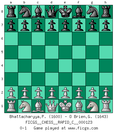 Last move : 0-1 2015 April 5 17:54:31 [Event "FICGS__CHESS__RAPID_C__000123"] [Site "FICGS"] [Date "2015.03.06"] [Round "1"] [White "Bhattacharyya,Pinaki"] [Black "O Brien,Glenn"] [Result "0-1"] [WhiteElo "1600"] [BlackElo "1643"] 0-1 This chess game has been lost on time (started : 2015.03.06 6:33:23) Player Black won this chess game. Follow this game move after move (download)Chess is as much a mystery as women. (Purdy) Im Wettkampf zwischen starken Meistern kommen Fehler sehr selten vor, deshalb ist es mit bloßem Warten nicht getan. (José Raúl Capablanca) Un sacrificio se refuta mucho mejor al aceptarlo. (Wilhelm Steinitz) Toute estimation doit être constamment réévaluée. (Jacob Estrin) All the troubles of the world come from being unable to sit alone in a quiet room. (Blaise Pascal)
