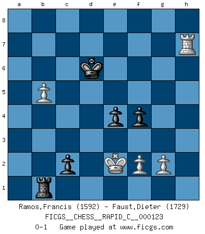 Last move : 0-1 2015 June 5 17:2:51 [Event "FICGS__CHESS__RAPID_C__000123"] [Site "FICGS"] [Date "2015.03.06"] [Round "1"] [White "Ramos,Francis"] [Black "Faust,Dieter"] [Result "0-1"] [WhiteElo "1592"] [BlackElo "1729"] 1.e4 c5 2.Nf3 Nc6 3.d4 cxd4 4.Nxd4 Nf6 5.Nc3 e5 6.Ndb5 d6 7.Bg5 a6 8.Na3 b5 9.Nd5 Be7 10.Bxf6 Bxf6 11.c3 O-O 12.Nc2 Bg5 13.Nce3 Be6 14.Bd3 Ne7 15.h4 Bxe3 16.Nxe3 d5 17.exd5 Nxd5 18.Nxd5 Qxd5 19.Qc2 f5 20.O-O Rad8 21.Rfd1 e4 22.Be2 Qc5 23.b4 Rxd1+ 24.Rxd1 Qc6 25.Qd2 Rc8 26.Qd6 Bxa2 27.Bh5 g6 28.Be2 Qxd6 29.Rxd6 Rxc3 30.Rxa6 Bc4 31.Rc6 Kf7 32.Rc5 Ke6 33.Bxc4+ bxc4 34.Kf1 f4 35.Ke2 Rc2+ 36.Ke1 Kd6 37.h5 gxh5 38.Rxh5 c3 39.Rxh7 Rc1+ 40.Ke2 Rb1 41.b5 c2 0-1 Sicilian : Pelikan (Lasker/Sveshnikov) variation Kingside Castling by player Black (move 11) Kingside Castling by player White (move 20) 10 pieces endgame at move 39 : White KRPPP , Black KRPPP WHITE : King + 1 Rook 3 Pawns BLACK : King + 1 Rook 3 Pawns Player Black won this chess game. Follow this game move after move (download)When I asked Fischer why he had not played a certain move in our game, he replied: 'Well, you laughed when I wrote it down !' (Mikhail Tal) Im Leben werden Partien nie so unstrittig gewonnen wie im Spiel (Emanuel Lasker) Por la belleza de sus partidas, la claridad de su juego y lo brillante de sus ideas, Fischer se creó el mismo como un artista de la misma estatura como Brahms, Rembrandt y Shakespeare. (David Levy) Aucun coup ne doit être joué sans but. (Pedro Damiano) The beginning is the most important part of the work. (Plato)