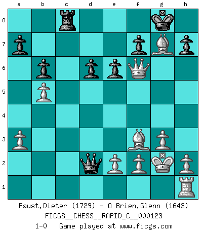 Last move : 1-0 2015 April 4 9:5:36 [Event "FICGS__CHESS__RAPID_C__000123"] [Site "FICGS"] [Date "2015.03.06"] [Round "1"] [White "Faust,Dieter"] [Black "O Brien,Glenn"] [Result "1-0"] [WhiteElo "1729"] [BlackElo "1643"] 1.d4 Nf6 2.c4 e6 3.Nf3 b6 4.g3 Ba6 5.Qc2 c5 6.dxc5 Bxc5 7.Bg2 Nc6 8.a3 Rc8 9.Nbd2 O-O 10.b4 Be7 11.b5 Bxb5 12.cxb5 Nb4 13.Qb1 Nc2+ 14.Kf1 Nxa1 15.Qxa1 Ng4 16.Bb2 Bf6 17.Nd4 Bxd4 18.Bxd4 Rc2 19.Bf3 Rxd2 20.Bxg4 Qg5 21.Bf3 Rb2 22.Bxb2 Qd2 23.Bxg7 Rc8 24.Qf6 d6 25.Kg2 1-0 Queen's Indian : Nimzovich variation (exaggerated Fianchetto) Kingside Castling by player Black (move 9) Player White won this chess game. Follow this game move after move (download)Before the endgame, the Gods have placed the middle game. (Siegbert Tarrasch) Ich brauche nur einen Blick auf das Schachbrett zu werfen, und weiß schon, was in der Stellung steckt, was geschehen kann und was geschehen wird. Alle übrigen suchen und prüfen, ich aber weiß es! (José Raúl Capablanca) Yo adoro todas la posiciones. Denme una partida posicional difícil, y la jugaré. Pero posiciones totalmente ganadas, no las tolero. (Hein Donner) Le jeu d'échecs est comme rejeté hors du temps. (Antoine de Saint-Exupéry) All war is based on deception. (Sun Tzu)