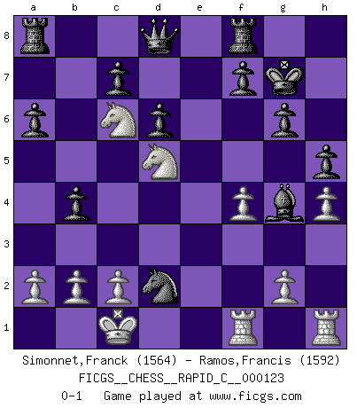 Last move : 0-1 2015 April 16 17:47:25 [Event "FICGS__CHESS__RAPID_C__000123"] [Site "FICGS"] [Date "2015.03.06"] [Round "1"] [White "Simonnet,Franck"] [Black "Ramos,Francis"] [Result "0-1"] [WhiteElo "1564"] [BlackElo "1592"] 1.d4 Nf6 2.Nf3 g6 3.Nc3 Bg7 4.e4 d6 5.Be3 O-O 6.Qd2 a6 7.Bd3 Nbd7 8.h4 e5 9.Bh6 exd4 10.Nxd4 Ne5 11.Be2 b5 12.Bxg7 Kxg7 13.O-O-O h5 14.f4 Neg4 15.Bxg4 Bxg4 16.Rdf1 b4 17.Nd5 Nxe4 18.Nc6 Nxd2 0-1 King's Indian : East Indian defense Kingside Castling by player Black (move 5) Queenside Castling by player White (move 13) Player Black won this chess game. Follow this game move after move (download)Combinations have always been the most intriguing aspect of Chess. The masters look for them, the public applauds them, the critics praise them. It is because combinations are possible that Chess is more than a lifeless mathematical exercise. They are the poetry of the game; they are to Chess what melody is to music. They represent the triumph of mind over matter. (Reuben Fine) Gegen einen Schachcomputer zu verlieren ist wie Löcher in den Strümpfen zuhaben. Es ist nicht peinlich, solange man der einzige ist der es weiß. (Anonymous) Bobby solo arroja las piezas y solas caen en las casillas correctas. (Miguel Najdorf ) Les erreurs sont comme les malheurs, elles n'arrivent jamais seules. (Siegbert Tarrasch) I know the human being and fish can coexist peacefully. (George W. Bush, Saginaw sept. 29, 2000)