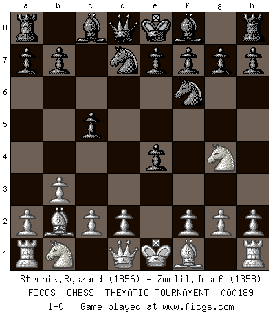 Last move : 1-0 2015 May 2 9:6:7 [Event "FICGS__CHESS__THEMATIC_TOURNAMENT__000189"] [Site "FICGS"] [Date "2015.03.06"] [Round "1"] [White "Sternik,Ryszard"] [Black "Zmolil,Josef"] [Result "1-0"] [WhiteElo "1856"] [BlackElo "1358"] 1.Nf3 d5 2.b3 c5 3.e4 dxe4 4.Ne5 Nf6 5.Bb2 Nbd7 6.Ng4 1-0 This chess game has been lost on time (started : 2015.03.06 6:34:1) Reti : Nimzovich-Larsen attack Player White won this chess game. Follow this game move after move (download)Is Bobby Fischer quite sane ? (Salo Flohr) Stil? Ich habe keinen Stil! (Anatoly Karpov) Una mala movida nulifica cuarenta buenas. (Horowitz) Karpov est une pièce de musée. (Garry Kasparov) Logic : The art of thinking and reasoning in strict accordance with the limitations and incapacities of the human misunderstanding. (Ambrose Bierce)