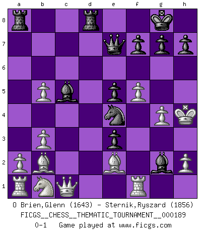 Last move : 0-1 2015 March 30 9:9:7 [Event "FICGS__CHESS__THEMATIC_TOURNAMENT__000189"] [Site "FICGS"] [Date "2015.03.06"] [Round "1"] [White "O Brien,Glenn"] [Black "Sternik,Ryszard"] [Result "0-1"] [WhiteElo "1643"] [BlackElo "1856"] 1.Nf3 d5 2.b3 c5 3.e4 dxe4 4.Ne5 Nf6 5.Bb2 Nbd7 6.Bb5 a6 7.Bc4 e6 8.f4 b5 9.Be2 Bd6 10.O-O Qc7 11.Nxd7 Bxd7 12.g3 e5 13.f5 O-O 14.d3 c4 15.dxc4 Bc5+ 16.Kg2 Bc6 17.cxb5 axb5 18.c4 Rfd8 19.Qc1 e3 20.Kh3 Qb7 21.Kh4 Bg2 22.cxb5 Qe7 23.g4 Ne4 0-1 Reti : Nimzovich-Larsen attack Kingside Castling by player White (move 10) Kingside Castling by player Black (move 13) Player Black won this chess game. Follow this game move after move (download)In life, as in Chess, one's own Pawns block one's way. A man's very wealth, ease, leisure, children, books, which should help him to win, more often checkmate him. (Charles Buxton) Unter Putin wird alles Geld aus Russland wie von einem Staubsauger nach Moskau umgeleitet, das ist wie ein schwarzes Loch. (Garry Kasparov) El Peón aislado arroja penumbra sobre todo el tablero. (Aaron Nimzovich) Avec des compensations pour le matériel en plus... (Anonyme) All battles are fought by scared men who'd rather be someplace else. (John Wayne in the movie In harm's way)