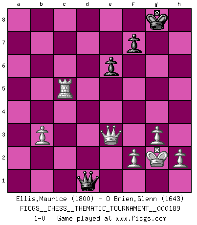 Last move : 1-0 2015 May 8 8:7:23 [Event "FICGS__CHESS__THEMATIC_TOURNAMENT__000189"] [Site "FICGS"] [Date "2015.03.06"] [Round "1"] [White "Ellis,Maurice"] [Black "O Brien,Glenn"] [Result "1-0"] [WhiteElo "1800"] [BlackElo "1643"] 1.Nf3 d5 2.b3 c5 3.e4 dxe4 4.Ng5 Nf6 5.Bc4 e6 6.Nc3 b6 7.Ngxe4 Nxe4 8.Nxe4 Qd4 9.Nc3 b5 10.Qf3 Qe5+ 11.Be2 b4 12.Qxa8 bxc3 13.O-O Bd6 14.Bb5+ Kf8 15.g3 a6 16.Bc4 g5 17.dxc3 Bd7 18.Bxa6 Qxc3 19.Bxg5 h6 20.Rad1 hxg5 21.Rxd6 Kg7 22.Qb7 Rc8 23.Rxd7 Nxd7 24.Qxc8 Ne5 25.Qd8 Nf3+ 26.Kh1 Qxc2 27.Bb7 g4 28.Bxf3 gxf3 29.Qg5+ Kh7 30.Qf6 Kg8 31.Qxf3 Qxa2 32.Qc3 Qe2 33.Kg1 Qh5 34.Ra1 Qd5 35.Rc1 Kh7 36.Qe3 Kg8 37.Rxc5 Qd1+ 38.Kg2 1-0 Reti : Nimzovich-Larsen attack Kingside Castling by player White (move 13) Player White won this chess game. Follow this game move after move (download)A strong memory, concentration, imagination, and a strong will is required to become a great Chess player. (Bobby Fischer) Ja, jede Frau in Holland liebt mich bestimmt, und alle Männer hassen mich. (Loek van Wely) Solo existe una cosa que Fischer hace en el Ajedrez sin placer: ¡perder!. (Boris Spassky) Les erreurs sont comme les malheurs, elles n'arrivent jamais seules. (Siegbert Tarrasch) I don't diet. I just don't eat as much as I'd like to. (Linda Evangelista, supermodel)