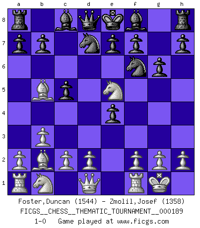 Last move : 1-0 2015 May 1 12:33:53 [Event "FICGS__CHESS__THEMATIC_TOURNAMENT__000189"] [Site "FICGS"] [Date "2015.03.06"] [Round "1"] [White "Foster,Duncan"] [Black "Zmolil,Josef"] [Result "1-0"] [WhiteElo "1544"] [BlackElo "1358"] 1.Nf3 d5 2.b3 c5 3.e4 dxe4 4.Ne5 Nd7 5.Bb5 g6 6.Bb2 Ngf6 7.O-O 1-0 This chess game has been lost on time (started : 2015.03.06 6:34:1) Reti : Nimzovich-Larsen attack Kingside Castling by player White (move 7) Player White won this chess game. Follow this game move after move (download)Life is like a game of Chess, changing with each move. (Chinese proverb) Die Leute spielen gegen mich seit 15 Jahren unter Ihren Möglichkeiten. (Robert James Fischer) Si el ingenio solamente fuese necesario para lucirse, las mujeres serían las mejores jugadoras de Ajedrez del mundo. (Albin) Vous m'avez demandé de vous exposer quel est le fondement de la prière. Je ne fais que préparer les pièces du jeu sur la table... Nous sera-t-il permis d'en adopter les règles et si nous les appliquons scrupuleusement nous ne tarderons pas à faire mat le Roi divin ! Il ne pourra échapper à nos mains. (Sainte Thérèse d'Avila, Chemin de perfection) The obstacle is the path. (Zen proverb)