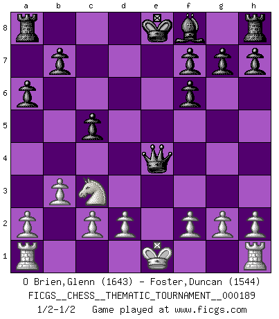 Last move : 1/2-1/2 2015 March 18 7:30:7 [Event "FICGS__CHESS__THEMATIC_TOURNAMENT__000189"] [Site "FICGS"] [Date "2015.03.06"] [Round "1"] [White "O Brien,Glenn"] [Black "Foster,Duncan"] [Result "1/2-1/2"] [WhiteElo "1643"] [BlackElo "1544"] 1.Nf3 d5 2.b3 c5 3.e4 dxe4 4.Ne5 Nf6 5.Bb2 Nbd7 6.Bb5 a6 7.Bc4 Nxe5 8.Bxe5 Bg4 9.Be2 Bxe2 10.Qxe2 Qd5 11.Bxf6 exf6 12.Nc3 Qe5 13.Qxe4 Qxe4+ 1/2-1/2 Reti : Nimzovich-Larsen attack This chess game ended in a draw. Follow this game move after move (download)I'm not a materialistic person, in that, I don't suffer the lack or loss of money. The absence of worldly goods I don't look back on. For Chess is a way I can be as materialistic as I want without having to sell my soul. (Jamie Walter Adams) Wenn ich einen Club besuche, sind die Spieler stumm vor Staunen. (José Raúl Capablanca) Me dio la sensación de como si yo estuviera jugando en contra del mismo Ajedrez. - al estar jugando en contra de Robert Fischer (Walter Shipman) Aux échecs, les retours au sommet sont rares : les dommages psychologiques consécutifs à une défaite sont trop sévères. (Daily Telegraph) Live, lose, and learn, by observing your opponent how to win. (Amber Steenbock)