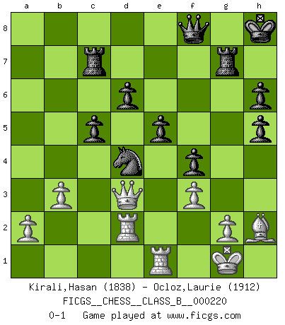 Last move : 0-1 2015 June 12 12:14:50 [Event "FICGS__CHESS__CLASS_B__000220"] [Site "FICGS"] [Date "2015.03.08"] [Round "1"] [White "Kirali,Hasan"] [Black "Ocloz,Laurie"] [Result "0-1"] [WhiteElo "1838"] [BlackElo "1912"] 1.d4 Nf6 2.c4 c5 3.d5 b5 4.Nf3 Bb7 5.Bf4 d6 6.e4 Nxe4 7.Bd3 Nf6 8.O-O h6 9.h4 g6 10.Nc3 bxc4 11.Bxc4 Bg7 12.Qd2 Nbd7 13.Bb5 Kf8 14.Rfe1 Nb6 15.Bc6 Bxc6 16.dxc6 Rc8 17.Re2 Kg8 18.Rae1 Bf8 19.Qd3 Rh7 20.b3 Rxc6 21.Ne5 Rc8 22.Rd1 Bg7 23.Bg3 Nh5 24.Bh2 Qf8 25.Nf3 Bxc3 26.Qxc3 f5 27.Qa5 Rc7 28.Re6 Rg7 29.Rde1 Kh7 30.Nd2 Rf7 31.Nc4 Ng7 32.R6e2 f4 33.Nxb6 axb6 34.Qxb6 e5 35.h5 gxh5 36.Qb5 Ne6 37.Rd2 Nd4 38.Qd3+ Kh8 39.f3 Rg7 0-1 Benko gambit Kingside Castling by player White (move 8) Player Black won this chess game. Follow this game move after move (download)We don't really know how the game was invented, though there are suspicions. As soon as we discover the culprits, we'll let you know. (Bruce Pandolfini) Die jungen Leute sollen verstehen, dass sie noch etwas von mir lernen können und müssen. (Viktor Kortschnoi) ¿Esta Bobby Fischer algo cuerdo?. (Salo Flohr) Dans le domaine de la peinture, de la gravure et de la sculpture, dès la première décennie de notre siècle, les artistes abandonnent la représentation de la partie d'échecs pour se concentrer sur les pièces, sur les échiquiers et sur toutes les variations auxquelles les unes et les autres peuvent donner lieu. On passe en quelque sorte d'un thème social à un thème musical (au sens de la musica médiévale, c'est-à-dire d'une notion qui inclue le rythme, l'harmonie, la construction et la déconstruction, etc.). Graphiquement et picturalement, l'échiquier apparaît comme une structure ouverte, dynamique, d'une richesse infinie, autorisant toutes les combinatoires et débouchant sur des mouvements et des rythmes de nature exponentielle. (Michel Pastoureau) A cynic is a man who knows the price of everything but the value of nothing. (Oscar Wilde)