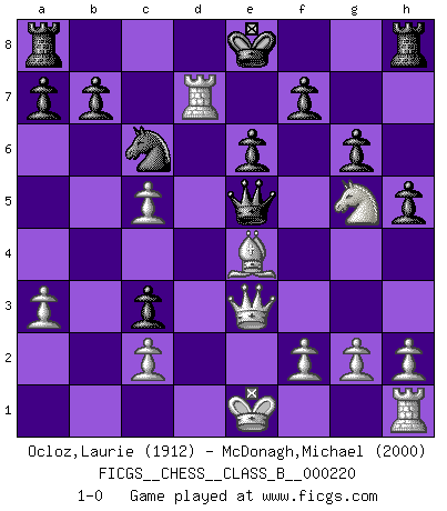 Last move : 1-0 2015 March 29 22:40:27 [Event "FICGS__CHESS__CLASS_B__000220"] [Site "FICGS"] [Date "2015.03.08"] [Round "1"] [White "Ocloz,Laurie"] [Black "McDonagh,Michael"] [Result "1-0"] [WhiteElo "1912"] [BlackElo "2000"] 1.e4 e6 2.d4 d5 3.Nc3 Nf6 4.Bg5 Bb4 5.e5 h6 6.Be3 Ne4 7.Qg4 g6 8.a3 Bxc3 9.bxc3 c5 10.Bd3 h5 11.Qf3 Nxc3 12.dxc5 d4 13.Bd2 Nc6 14.Bxc3 dxc3 15.Qe3 Qd5 16.Nf3 Bd7 17.Rd1 Qa2 18.Ng5 Qd5 19.Be4 Qxe5 20.Rxd7 1-0 French : MacCutcheon, Janowski variation Player White won this chess game. Follow this game move after move (download)Fischer is the strongest player in the world. In fact, the strongest player who ever lived. (Larry Evans) Wie bekannt hörte Morphy 1859 auf, Schach zu spielen. Seine Enttäuschung galt nicht so sehr dem Schach, wie den Schachspielern. (Robert James Fischer) ¿Porque tengo que perder ante este idiota?. (Aron Nimzovich) Je fais ceci parce que dans cinquante coups j'obtiendrai cela; je m'appelle Mikhail Moisevitch Botvinnik. (Botvinnik) I live to kill Traxler counterattack. (Ilmars Cirulis)