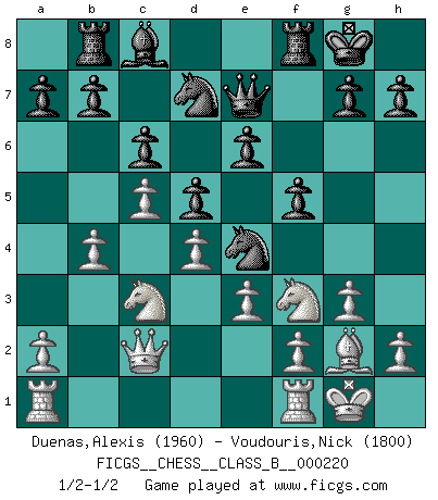 Last move : 1/2-1/2 2015 March 18 16:59:6 [Event "FICGS__CHESS__CLASS_B__000220"] [Site "FICGS"] [Date "2015.03.08"] [Round "1"] [White "Duenas,Alexis"] [Black "Voudouris,Nick"] [Result "1/2-1/2"] [WhiteElo "1960"] [BlackElo "1800"] 1.d4 d5 2.c4 e6 3.Nc3 f5 4.Nf3 c6 5.g3 Bd6 6.Bg2 Nf6 7.O-O O-O 8.Qc2 Ne4 9.Bf4 Qe7 10.e3 Nd7 11.c5 Bb8 12.Bxb8 Rxb8 13.b4 1/2-1/2 QGD : 3.Nc3 Kingside Castling by player White (move 7) Kingside Castling by player Black (move 7) This chess game ended in a draw. Follow this game move after move (download)When your house is on fire, you can't be bothered with the neighbors. Or, as we say in Chess, if your King is under attack you don't worry about losing a Pawn on the Queen's side. (Gary Kasparov) Ich trinke, ich rauche, ich spiele, ich liebe Frauen aber Fernschach ist ein Laster, das ich nicht habe. (Mikhail Nekhemyevich Tal) El Ajedrez es una manera fabulosa para que los niños aprendan a autovalorarse y a autoestimarse. (Saudin Robovic) En blitz, le Cavalier l'emporte sur le Fou. (Vlastimil Hort) Question: Is 'This statement is paradoxical' a paradoxical statement ? Or is it a meta-paradox ? (Normajean Yates)