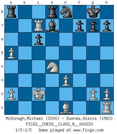 Last move : 1/2-1/2 2015 April 12 13:27:18 [Event "FICGS__CHESS__CLASS_B__000220"] [Site "FICGS"] [Date "2015.03.08"] [Round "1"] [White "McDonagh,Michael"] [Black "Duenas,Alexis"] [Result "1/2-1/2"] [WhiteElo "2000"] [BlackElo "1960"] 1.e4 c5 2.c3 d5 3.exd5 Qxd5 4.d4 Nc6 5.Nf3 Nf6 6.dxc5 Qxd1+ 7.Kxd1 e5 8.b4 e4 9.Nd4 a5 10.Bb5 Bd7 11.Bxc6 bxc6 12.Nd2 e3 13.fxe3 Nd5 14.bxa5 Bxc5 15.N2b3 Nxc3+ 16.Kc2 Ne4 17.Nxc5 Nxc5 18.Rb1 O-O 19.Bd2 Ne4 20.Rb7 Rfd8 21.Be1 Nd6 22.Rc7 Ne8 23.Rb7 Nd6 24.Rc7 Ne8 1/2-1/2 Sicilian : Alapin's variation (2.c3) Kingside Castling by player Black (move 18) This chess game ended in a draw. Follow this game move after move (download)The isolated Pawn casts gloom over the entire chessboard. (Aaron Nimzovich) Ich hatte Angst gegen einen russischen Großmeister zu verlieren, und er befürchtete gegen einen kleinen Jungen zu verlieren. (über ein Remis gegen Juri Awerbach). (Robert James Fischer) Bobby Fischer es el jugador de Ajedrez mas grande que jamás haya existido. (Ken Smith) Si le désir cupide (et stupide) de gagner est une inépuisable source de souffrance, une combinaison brillante sur l'échiquier est une découverte : le coquelicot qui s'épanouit lorsque apparaît la Voie Lactée. (Arrabal) The large trees attract high winds. (Chinese proverb)