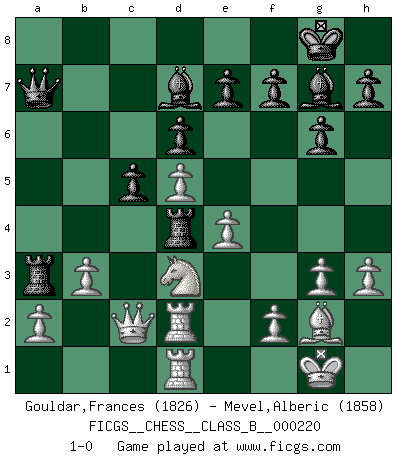 Last move : 1-0 2015 October 10 0:43:39 [Event "FICGS__CHESS__CLASS_B__000220"] [Site "FICGS"] [Date "2015.03.08"] [Round "1"] [White "Gouldar,Frances"] [Black "Mevel,Alberic"] [Result "1-0"] [WhiteElo "1826"] [BlackElo "1858"] 1.d4 Nf6 2.c4 c5 3.d5 b5 4.cxb5 a6 5.bxa6 g6 6.a7 Rxa7 7.Nc3 Ba6 8.Nf3 Bg7 9.g3 O-O 10.Bg2 d6 11.O-O Nbd7 12.Re1 Qa8 13.e4 Ng4 14.Bf4 Rb8 15.Rb1 Nge5 16.Nxe5 Nxe5 17.Bxe5 Bxe5 18.Qc2 Bc4 19.b3 Ra3 20.Ne2 Bb5 21.Nc1 Bd7 22.Re2 Bg7 23.h3 Qa7 24.Rd2 Rb4 25.Nd3 Rd4 26.Rbd1 1-0 This chess game has been lost on time (started : 2015.03.08 18:22:10) Benko gambit accepted Kingside Castling by player Black (move 9) Kingside Castling by player White (move 11) Player White won this chess game. Follow this game move after move (download)In the perfect Chess combination as in a first-rate short story, the whole plot and counter-plot should lead up to a striking finale, the interest not being allayed until the very last moment. (Yates and Winter) Garry Kasparov war erst in der Großmeister-Organisation GMA, dann in der Profischach-Vereinigung PCA, zum Schluss kehrte er wieder in den Schoß der FIDE zurück. Aber gut, manche Leute sind flexibel (Viswanathan Anand) Muchos jugadores de Ajedrez se sorprendían cuando después de la partida, Fischer explicaba con calma: 'Yo ya había analizado esta posibilidad' en una posición en la cual yo creía que no era posible de prever desde la apertura. (Mikhail Tal) Il a essayé de se convaincre qu'il pourrait empêcher toutes les erreurs et ne jamais perdre. L'horreur ! Gary Kasparov au sujet de Robert Fischer. The age of a woman doesn't mean a thing. The best tunes are played on the oldest fiddles. (Ralph Waldo Emerson)