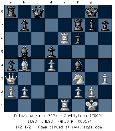 Last move : 1/2-1/2 2015 April 1 20:38:7 [Event "FICGS__CHESS__RAPID_A__000174"] [Site "FICGS"] [Date "2015.03.08"] [Round "1"] [White "Ocloz,Laurie"] [Black "Sorbi,Luca"] [Result "1/2-1/2"] [WhiteElo "1912"] [BlackElo "2000"] 1.e4 e5 2.Nf3 Nf6 3.Nxe5 d6 4.Nf3 Nxe4 5.d4 d5 6.Bd3 Nc6 7.O-O Be7 8.c4 Nf6 9.Nc3 O-O 10.h3 Nb4 11.Be2 dxc4 12.Bxc4 c6 13.Re1 Nbd5 14.Nxd5 Nxd5 15.Bxd5 cxd5 16.Qb3 Bd6 17.Bg5 f6 18.Bd2 Rf7 19.Re3 Bd7 20.Rae1 Bc6 21.Bb4 Bf4 22.Re6 a5 23.Bc5 a4 24.Qa3 Qc8 25.R6e2 Bc7 26.Bd6 Ba5 27.Bb4 Bb5 28.Re6 Bc7 29.Nd2 Bd7 30.R6e3 Bb6 31.Rc3 Bc6 32.Bc5 Ba5 33.Bb4 Bb6 34.Nf3 Bc7 35.Bd6 Ba5 36.Bb4 Bc7 37.Rce3 Bb5 38.Re6 Bd7 39.R6e2 Bb5 40.Re3 Bf4 41.Re6 1/2-1/2 Petrov : Classical attack Kingside Castling by player White (move 7) Kingside Castling by player Black (move 9) This chess game ended in a draw. Follow this game move after move (download)Checkers is for tramps. (Paul Morphy) Man wirke der falschen Auffassung entgegen, als ob jeder Zug Unmittelbares zu leisten habe; auch Werte- und Ruhezüge haben ihre Existenzberechtigung. (Aaron Nimzowitsch) Yo he agregado estos principios a la ley: pongan los Caballos en acción antes de que los dos Alfiles sean desarrollados. (Emanuel Lasker) Un footballeur joue avec ses pieds, parfois avec sa tête. Un joueur d'échecs ne joue qu'avec sa tête. Et quand il ne joue plus, il meurt. (Jacob Murray) Ah, beer! The cause of, and the solution to, all of life's problems. (Homer Simpson)