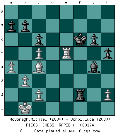 Last move : 0-1 2015 June 5 23:57:43 [Event "FICGS__CHESS__RAPID_A__000174"] [Site "FICGS"] [Date "2015.03.08"] [Round "1"] [White "McDonagh,Michael"] [Black "Sorbi,Luca"] [Result "0-1"] [WhiteElo "2000"] [BlackElo "2000"] 1.e4 e5 2.Nf3 Nf6 3.Nxe5 d6 4.Nf3 Nxe4 5.Nc3 Nxc3 6.dxc3 Be7 7.Be3 O-O 8.Qd2 Nd7 9.O-O-O c6 10.g4 Qa5 11.Kb1 Ne5 12.Nxe5 dxe5 13.Be2 Be6 14.c4 Qxd2 15.Rxd2 f5 16.gxf5 Bxf5 17.c5 Be6 18.Rg1 g6 19.b3 Rad8 20.Rgd1 Kg7 21.Rxd8 Bxd8 22.Rd6 Bc8 23.Bc4 Bc7 24.Rd1 Bg4 25.Rg1 h5 26.Re1 Ba5 27.Rg1 Bc3 28.a4 Bd4 29.Re1 Bxe3 30.Rxe3 Rxf2 31.Rxe5 Kf6 0-1 This chess game has been lost on time (started : 2015.03.08 18:33:24) Petrov : Nimzovich attack Kingside Castling by player Black (move 7) Queenside Castling by player White (move 9) Player Black won this chess game. Follow this game move after move (download)Chess, like love, is infectious at any age. (Flohr) Kostenjuk hat keinen Sexappeal. (Loek van Wely) Bobby Fischer es el jugador de Ajedrez mas grande que jamás haya existido. (Ken Smith) Je fais ceci parce que dans cinquante coups j'obtiendrai cela; je m'appelle Mikhail Moisevitch Botvinnik. (Botvinnik) Wawaweewa ! (Borat: Cultural learnings of America for make benefit glorious nation of Kazakhstan)