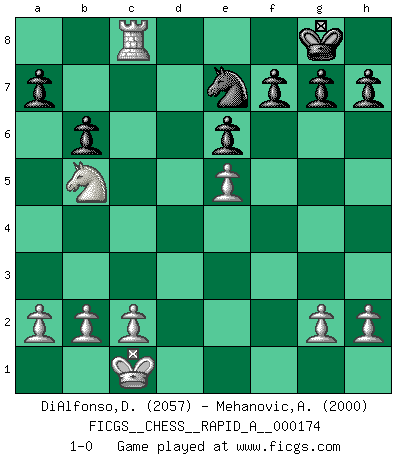Last move : 1-0 2015 May 15 22:5:40 [Event "FICGS__CHESS__RAPID_A__000174"] [Site "FICGS"] [Date "2015.03.08"] [Round "1"] [White "DiAlfonso,Darren"] [Black "Mehanovic,Adnan"] [Result "1-0"] [WhiteElo "2057"] [BlackElo "2000"] 1.e4 c5 2.Nf3 Nc6 3.d4 cxd4 4.Nxd4 Nf6 5.Nc3 d6 6.Bg5 e6 7.Qd2 Be7 8.O-O-O O-O 9.f4 Nxd4 10.Qxd4 Qa5 11.e5 dxe5 12.Qxe5 Qxe5 13.fxe5 Nd5 14.Bxe7 Nxe7 15.Bd3 b6 16.Be4 Rb8 17.Rhe1 Bb7 18.Rd7 Bxe4 19.Rxe4 Nc6 20.Nb5 Rbd8 21.Rc7 Rc8 22.Rxc8 Rxc8 23.Rc4 Ne7 24.Rxc8+ 1-0 This chess game has been lost on time (started : 2015.03.08 18:33:24) Sicilian defense Queenside Castling by player White (move 8) Kingside Castling by player Black (move 8) Player White won this chess game. Follow this game move after move (download)Though most people love to look at the games of the great attacking masters, some of the most successful players in history have been the quiet positional players. They slowly grind you down by taking away your space, tying up your pieces, and leaving you with virtually nothing to do ! (Yasser Seirawan) Kein Schachspieler kann gut schlafen. (H. G. Wells) Cada Peón es una Reina en potencia. (James Mason) Le succès, c'est être capable d'aller d'échec en échec sans perdre son enthousiasme. (Winston Churchill) Wisdom begins at the end. (Daniel Webster)