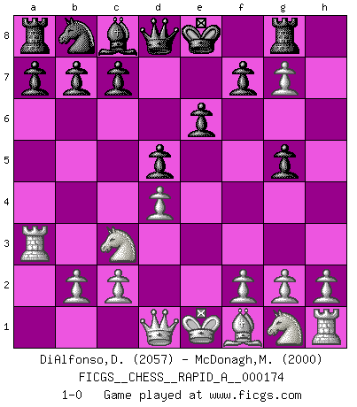 Last move : 1-0 2015 March 9 23:9:6 [Event "FICGS__CHESS__RAPID_A__000174"] [Site "FICGS"] [Date "2015.03.08"] [Round "1"] [White "DiAlfonso,Darren"] [Black "McDonagh,Michael"] [Result "1-0"] [WhiteElo "2057"] [BlackElo "2000"] 1.e4 e6 2.d4 d5 3.Nc3 Nf6 4.Bg5 Bb4 5.e5 h6 6.exf6 hxg5 7.fxg7 Rg8 8.a3 Bxa3 9.Rxa3 1-0 French : MacCutcheon, Chigorin variation Player White won this chess game. Follow this game move after move (download)I love all positions. Give me a difficult positional game, I will play it. But totally won positions, I cannot stand them. (Hein Donner) Es ist wirklich schade, dass so viele Schachspieler nicht auf ihr Äußeres achten! (Alexandra Kosteniuk) Si un gobernante no entiende al Ajedrez, ¿como puede governar él un reinado?. (El Rey Khusros II) D'abord les bases : Jouez et étudiez, puis étudiez et jouez, ensuite jouez et étudiez, puis étudiez et jouez. Deuxièmement : Donnez toujours le meilleur de vous-même ! (Ken Smith) If computers get too powerful, we can organize them into committees. That'll do them in. (Anonymous)