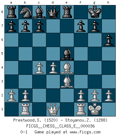 Last move : 0-1 2007 June 4 18:16:34 [Event "FICGS__CHESS__CLASS_E__000036"] [Site "FICGS"] [Date "2007.03.03"] [Round "1"] [White "Prestwood,Scott"] [Black "Stoyanov,Zdravko"] [Result "0-1"] [WhiteElo "1520"] [BlackElo "1288"] 1.d4 d5 2.e4 e6 3.Nd2 dxe4 4.Nxe4 h6 5.Nf3 Nf6 6.Bd3 Nxe4 7.Bxe4 Be7 8.O-O O-O 9.c4 Bf6 10.Be3 Re8 11.Rb1 e5 12.Nxe5 Bxe5 0-1 This chess game has been lost on time (started : 2007.03.03 1:5:33) Blackmar gambit Kingside Castling by player White (move 8) Kingside Castling by player Black (move 8) Player Black won this chess game. Follow this game move after move (download)Bobby Fischer is the greatest Chess genius of all time ! (Alexander Kotov) Karpov ist ein Museumsstück. (Garry Kasparov) Solo el jugador con la iniciativa tiene el derecho a atacar. (Wilhelm Steinitz) Les sacrifices démontrent seulement que quelqu'un a gaffé. (Savielly Tartacover) It's unlucky to be superstitious. (Dave Enteles)