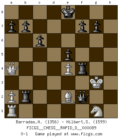 Last move : 0-1 2015 March 24 20:38:46 [Event "FICGS__CHESS__RAPID_D__000089"] [Site "FICGS"] [Date "2015.03.09"] [Round "1"] [White "Barradas,Anderson"] [Black "Hilbert,Stephan J."] [Result "0-1"] [WhiteElo "1356"] [BlackElo "1599"] 1.e4 d5 2.exd5 Qxd5 3.Nc3 Qa5 4.Nf3 Nf6 5.Bd3 Bg4 6.O-O Qh5 7.Be2 e5 8.d3 Bd6 9.Ne4 Nxe4 10.dxe4 Nc6 11.h3 Bxh3 12.Ng5 Qh4 13.Nxh3 h6 14.Bg4 Rd8 15.g3 Qe7 16.Qe2 Nd4 17.Qe1 Nxc2 18.Qa5 Nxa1 19.Qa4+ c6 20.Be3 h5 21.Be2 Bc5 22.Bxc5 Qxc5 23.Rxa1 Rd2 24.Kf1 Rxb2 25.Ng1 h4 26.gxh4 Rxh4 27.Kg2 Rg4+ 28.Kf3 Rf4+ 29.Kg3 Qxf2+ 0-1 Scandinavian (centre counter) defense Kingside Castling by player White (move 6) Player Black won this chess game. Follow this game move after move (download)Chess books should be used as we use glasses: to assist the sight, although some players make use of them as if they thought they conferred sight. (Jose Raul Capablanca) Im Schach nämlich geht es darum, daß Ich des Gegners klein zu kriegen, sein Ego zu zerbrechen und zu zermahlen, seine Selbstachtung zu zertreten und zu verscharren und seine ganze mißachtenswerte sogenannte Persönlichkeit ein für alle Mal tot zu hacken und zu zerstampfen und dadurch die menschliche Gesellschaft von einer stinkenden Pestbeule zu befreien. Es ist ein königliches Spiel. (Robert James Fischer) Hoy en día, si tu no eres un Gran Maestro a los 14 años, es mejor que lo olvides. (Anand Viswanathan) On croit qu'il y a plus de mauvais joueurs que de bons joueurs, c'est faux : Il y a autant de joueurs qui gagnent que de joueurs qui perdent. (Philippe Geluck) Nothing is more important for teaching us to understand the concepts we have than constructing fictitious ones. (Ludwig Wittgenstein)