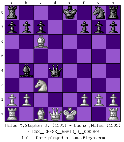 Last move : 1-0 2015 March 23 19:34:14 [Event "FICGS__CHESS__RAPID_D__000089"] [Site "FICGS"] [Date "2015.03.09"] [Round "1"] [White "Hilbert,Stephan J."] [Black "Budnar,Milos"] [Result "1-0"] [WhiteElo "1599"] [BlackElo "1303"] 1.e4 e5 2.Nf3 Nc6 3.d4 exd4 4.c3 d5 5.exd5 Qxd5 6.cxd4 Bb4+ 7.Nc3 Bg4 8.Be2 Bxf3 9.Bxf3 Qxd4 10.Bxc6+ 1-0 Scotch : Goering gambit Player White won this chess game. Follow this game move after move (download)After black's reply to 1.e4 with 1..e5, leaves him always trying to get into the game. (Howard Staunton) Vom Schach wurde gesagt das Leben sei dafür nicht lange genug. Aber das ist der Fehler des Lebens, nicht des Schach'. (Irving Chernev) Una buena ofensiva y una buena defensa, comienzan ambas con un buen desarrollo. (Bruce A. Moon) A chaque perte on perd un peu de soi. (Joël Lautier) In God we trust, all others we virus scan. (Anonymous)