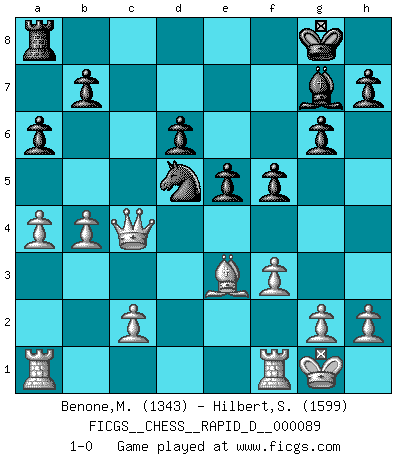 Last move : 1-0 2015 May 11 18:21:12 [Event "FICGS__CHESS__RAPID_D__000089"] [Site "FICGS"] [Date "2015.03.09"] [Round "1"] [White "Benone,Mateia"] [Black "Hilbert,Stephan J."] [Result "1-0"] [WhiteElo "1343"] [BlackElo "1599"] 1.Nf3 d6 2.d4 g6 3.e4 Bg7 4.Nc3 Bg4 5.Be3 Nc6 6.Bb5 a6 7.Be2 e5 8.d5 Nce7 9.Nd2 Bxe2 10.Qxe2 f5 11.f3 Nf6 12.O-O O-O 13.a4 Qd7 14.b4 c6 15.Nc4 cxd5 16.Nb6 Qc7 17.Ncxd5 Nexd5 18.Nxa8 Rxa8 19.exd5 Nxd5 20.Qd3 Qc4 21.Qxc4 1-0 Reti Opening Kingside Castling by player White (move 12) Kingside Castling by player Black (move 12) Player White won this chess game. Follow this game move after move (download)You know you're going to lose. Even when I was ahead I knew I was going to lose. - On playing against Fischer. (Andrew Soltis) Karpov ist ein Museumsstück. (Garry Kasparov) Si tu oponente no puede hacer nada activo, entonces no apures la posición; En vez de eso, dejalo estar sentado ahí, sufriendo y rogandote por un empate. (Jeremy Silman) Les échecs sont un jeu terrible. Si vous n'avez pas le centre, votre adversaire a une position plus libre. Par contre, si vous avez le centre, alors vous avez vraiment quelque chose pour laquelle vous inquiéter ! (Siegbert Tarrasch) In theory there is no difference between theory and practice. In practice there is. (Yogi Berra)