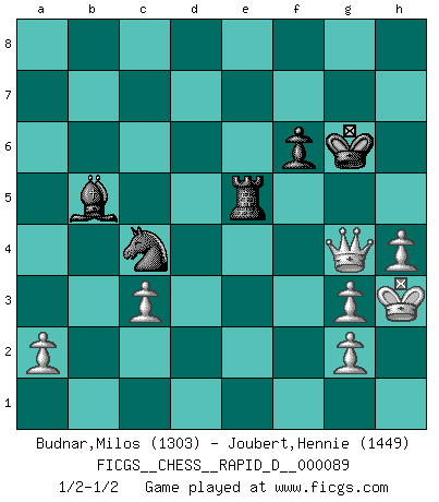 Last move : 1/2-1/2 2015 May 4 13:4:52 [Event "FICGS__CHESS__RAPID_D__000089"] [Site "FICGS"] [Date "2015.03.09"] [Round "1"] [White "Budnar,Milos"] [Black "Joubert,Hennie"] [Result "1/2-1/2"] [WhiteElo "1303"] [BlackElo "1449"] 1.e4 c5 2.Nf3 e6 3.d4 cxd4 4.Nxd4 Nf6 5.Nc3 Qb6 6.e5 Bc5 7.Be3 Nd5 8.Nxd5 exd5 9.Be2 Nc6 10.c3 Nxe5 11.b4 Bxd4 12.Bxd4 Qd6 13.O-O O-O 14.Bc5 Qg6 15.Bxf8 Kxf8 16.Qxd5 Nc6 17.Bd3 Qf6 18.Rae1 d6 19.Bxh7 g6 20.b5 Ne7 21.Qe4 Be6 22.Qxb7 Rc8 23.Qxa7 Kg7 24.b6 Nc6 25.Qa3 Bc4 26.b7 Rb8 27.Bxg6 Qxg6 28.Re3 Bxf1 29.Rg3 Qxg3 30.fxg3 Bb5 31.Qxd6 Rxb7 32.h4 Re7 33.Qd2 f6 34.Kh2 Ne5 35.Kh3 Nc4 36.Qd4 Re5 37.Qg4+ Kh6 38.Qf4+ Kg6 39.Qg4+ Kf7 40.Qd4 Kg6 41.Qg4+ Kf7 42.Qd4 Kg6 43.Qg4+ 1/2-1/2 Sicilian : Anderssen variation Kingside Castling by player White (move 13) Kingside Castling by player Black (move 13) This chess game ended in a draw. Follow this game move after move (download)It is peculiar but a fact nevertheless, that gamblers in chess always have enthusiastic followers. (Botvinnik) Ich verstehe den Grund nicht, warum die Aufteilung in Frauen und Männer überhaupt im Schach besteht. (Judith Polgar) Con o sin el título, Bobby Fischer fue sin lugar a dudas el mas grande jugador de su época. (Burt Hochberg) Mon pion favori sur ma case favorite ! Bronstein en parlant d'un coup de pion en h5 quand il avait les Noirs. When I took office, only high energy physicists had ever heard of what is called the World Wide Web... Now even my cat has its own page. (Bill Clinton, 1996)